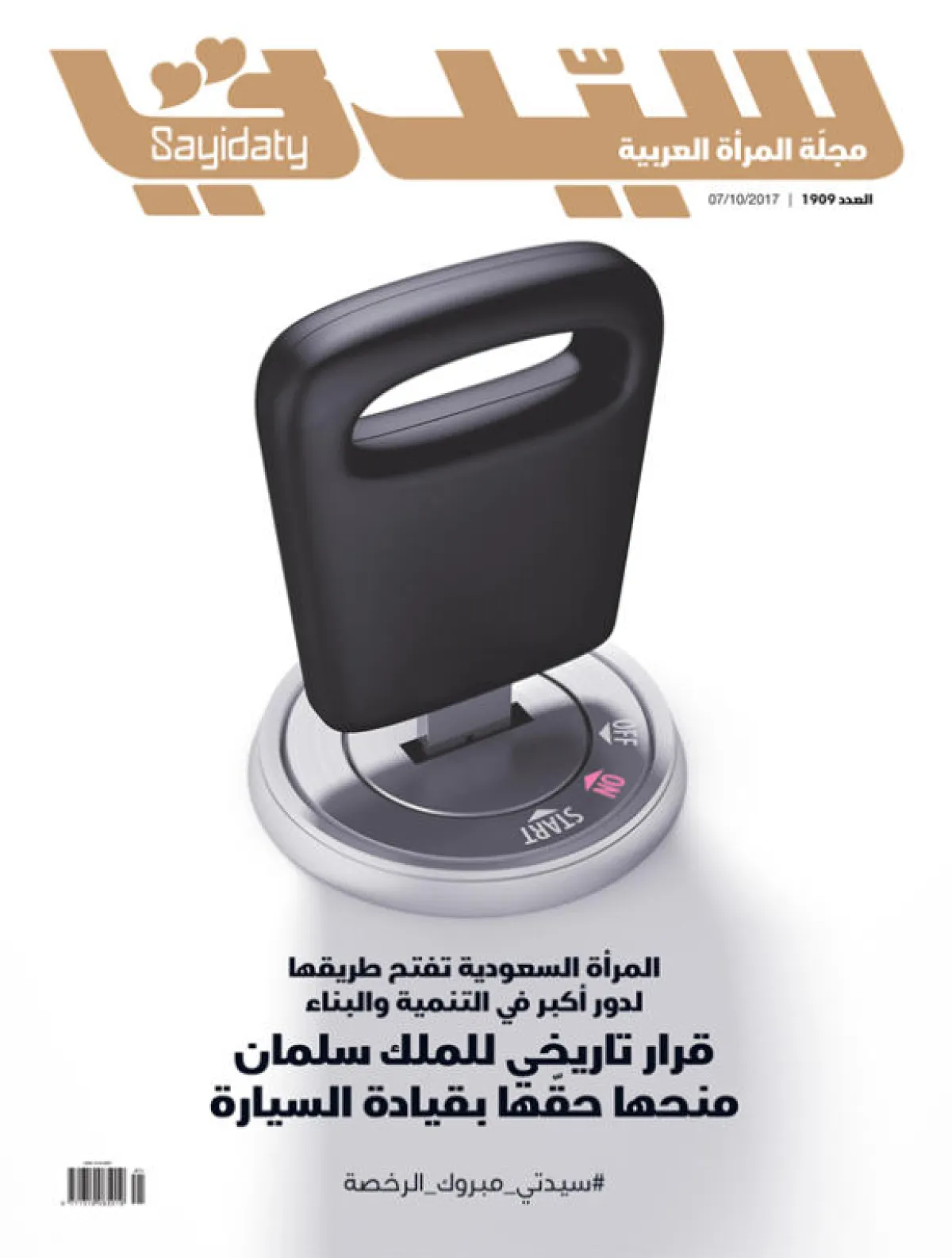ما هذا ولماذا..؟ ليست فنانة، ليس ثنائياً معروفاً؟ .. ثم أين عناوين آخر الدراسات وبحوث الصحة، ببساطة أين ولماذا غابت عناوين غلاف "سيدتي" في العدد 1909 الصادر في 7 أكتوبر 2017؟ العنوان الوحيد الموجود، هو "المرأة السعودية تفتح طريقها لدور أكبر في التنمية والبناء"، والصورة لمفتاح مركبة، كتبت عليه علامة البدء، "ON " باللون الوردي، ولكن علامة التوقف "OFF" كانت باللون العادي، لتكون رمزاً يعبر عن انطلاق فرحة أطياف المجتمع كلها بالأمر السامي، الذي انتصر فيه خادم الحرمين الشريفين الملك سلمان بن عبدالعزيز، للمرأة السعودية بالسماح لها بقيادة السيارة.