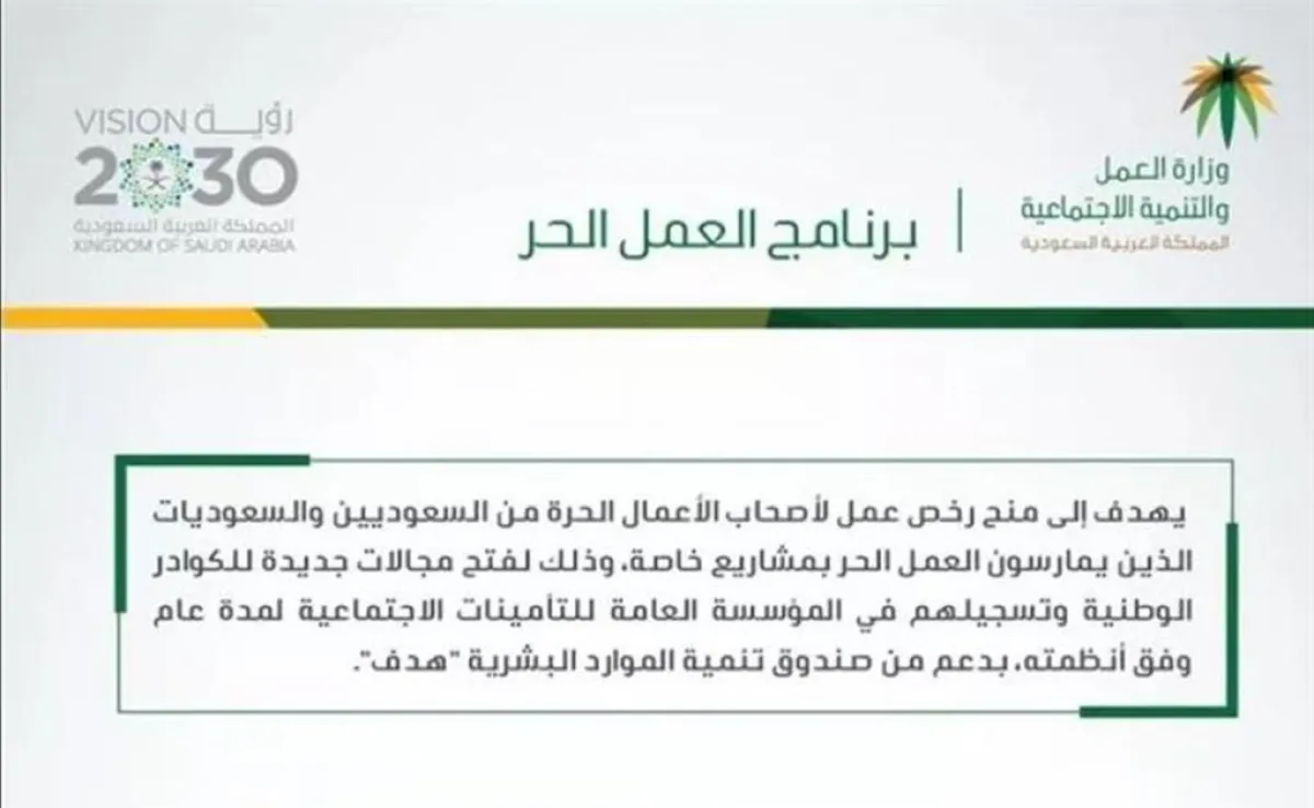 وأضاف أبا الخيل، وفقاً لـ«سبق»، أنه يشترط للحصول على هذه الوثيقة أن يكون عمر المتقدم أو المتقدمة من 18-60 سنة، ويحمل الجنسية السعودية، أما من يرغب الحصول على دعم صندوق الموارد البشرية أو بنك التنمية الاجتماعية أو غيرها من برامج الدعم، فهذا يشترط ألا يكون طالباً أو مسجلاً في التأمينات الاجتماعية أو التقاعد، ويمكن لأي شاب أن يتقدم الآن ليحصل على رخصة العمل الحر بها، بلا شروط، وتعد شهادة له.
