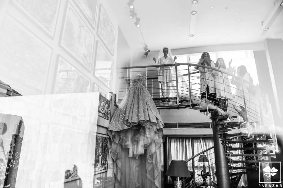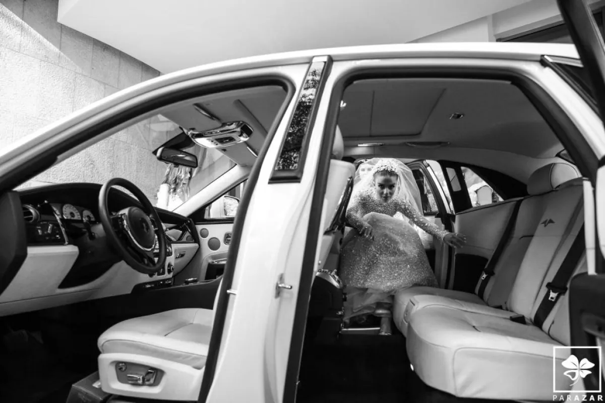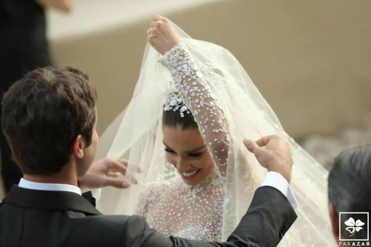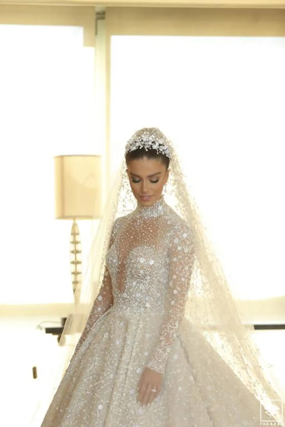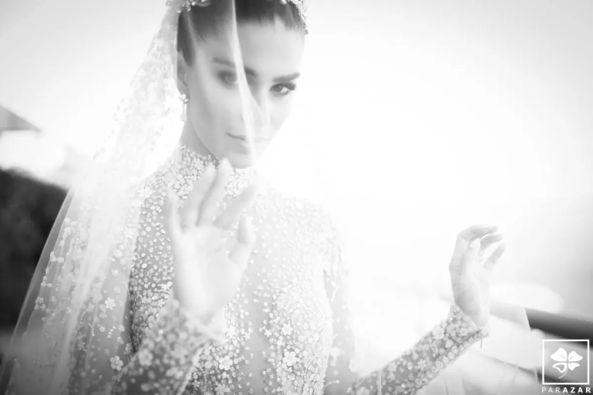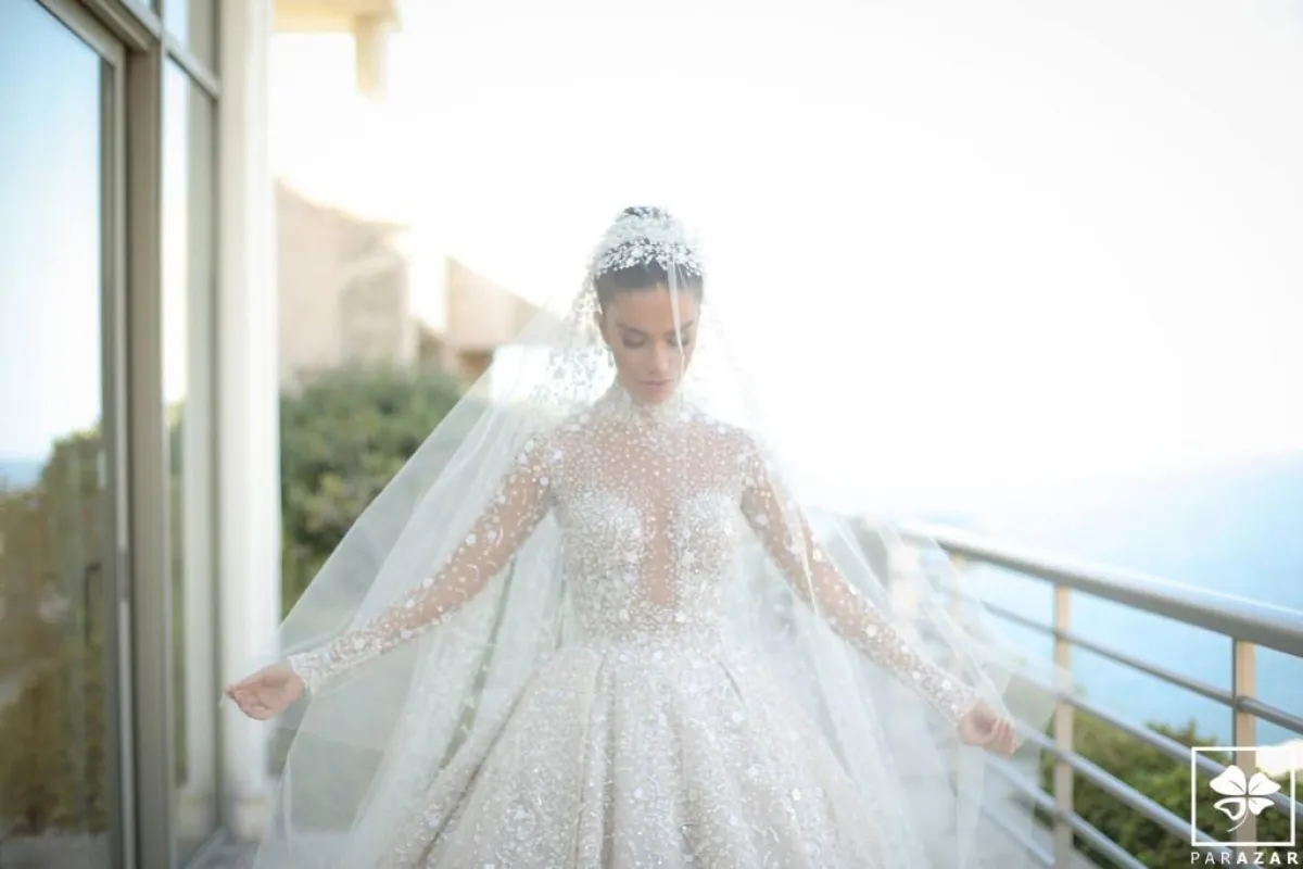 وبدت العروس في غاية الأناقة بفستان مرصّع بالماس وأحجار السوروفسكي، من تصميم اللبناني العالمي زهير مراد، أما تسريحة شعرها فاختارت العروس الشينيون المرتفع والطرحة المنفوشة، وبعد مراسم الزفاف الرسمية، غيّرت العروس تسريحتها لتختار الشعر المنسدل مع اكسسوار برّاق.