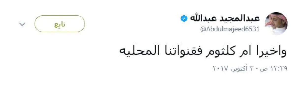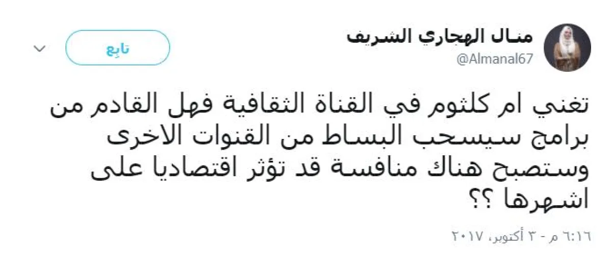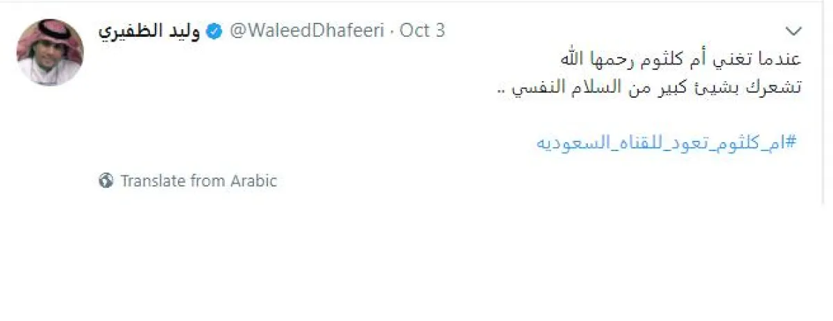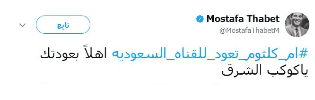 من جهته، أعرب رئيس تحرير موقع جريدة "الفجر" المصرية مصطفى ثابت، عن السعادة التي تتملكه بعد عودة صوت الفنانة أم كلثوم للقنوات العربية، مغردًا بوسم "أم كلثوم تعود للقناة الثقافية" بقوله: أهلًا بعودتكِ يا كوكب الشرق .