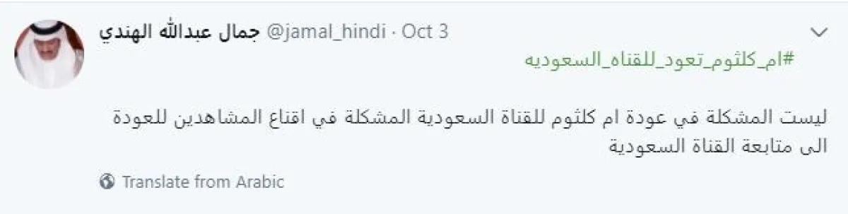 وحول إعراب بعض المؤثرين في مواقع التواصل الاجتماعي عن مدى تقبّلهم للفكرة، لكن يصيبهم الفضول حول كيفية إقناع المجتمع في العودة للتلفزيون السعودي بعدما هجروه لفترات طويلة، يكتب مستشار تقنية المعلومات أ. جمال الهندي: ليست المشكلة في عودة أم كلثوم للقناة السعودية، المشكلة في إقناع المشاهدين للعودة إلى متابعة القناة السعودية.