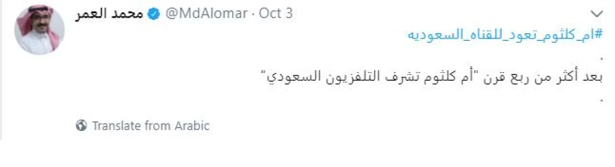 فيما أعرب الكاتب محمد العمر عن مدى تقبّله لتلك الفكرة وعودة الموسيقى للشاشة السعودية، التي ستحييها من جديد، معبّرًا بقوله: بعد أكثر من ربع قرن، أم كلثوم تشرّف التلفزيون السعودي.