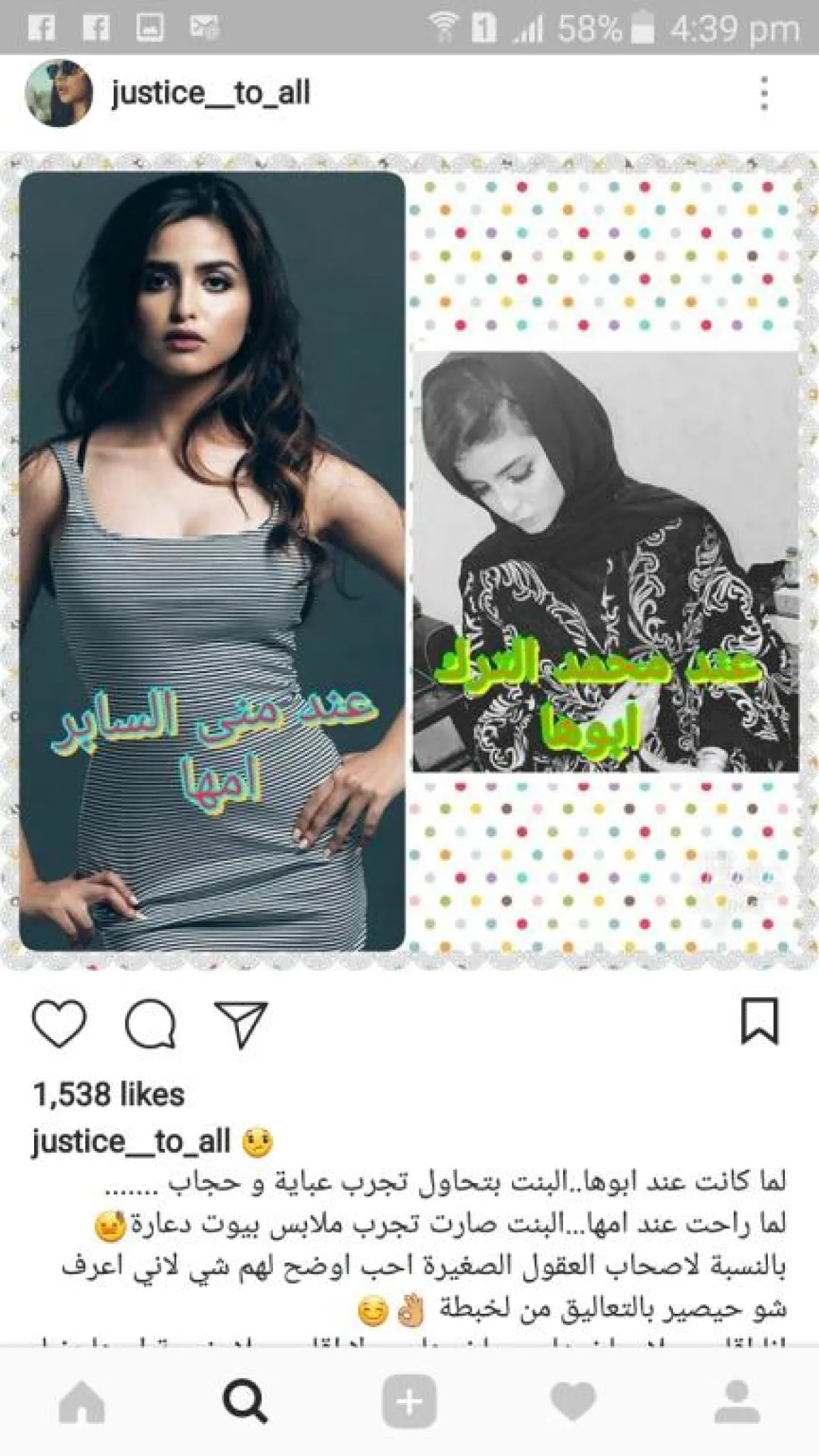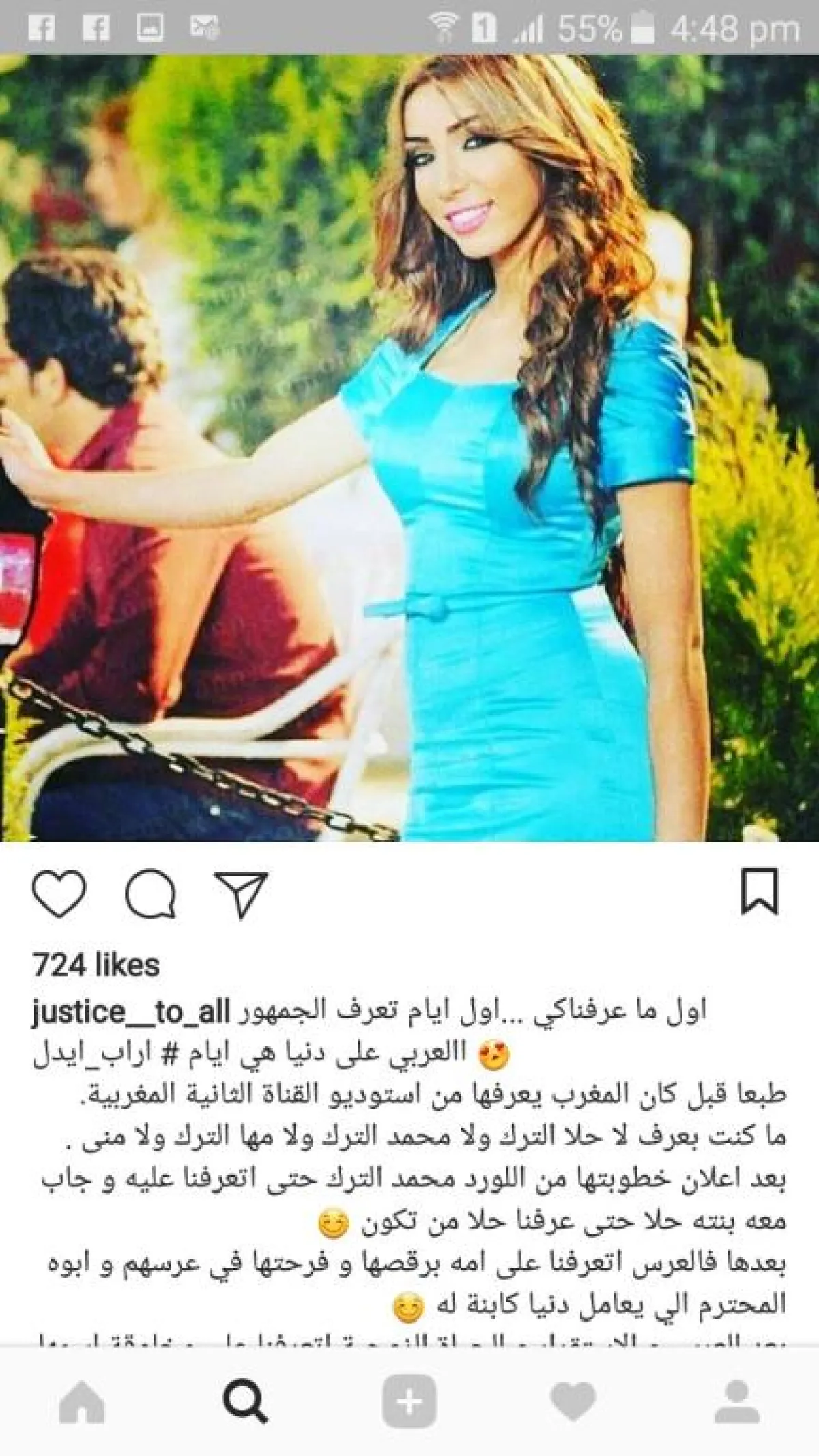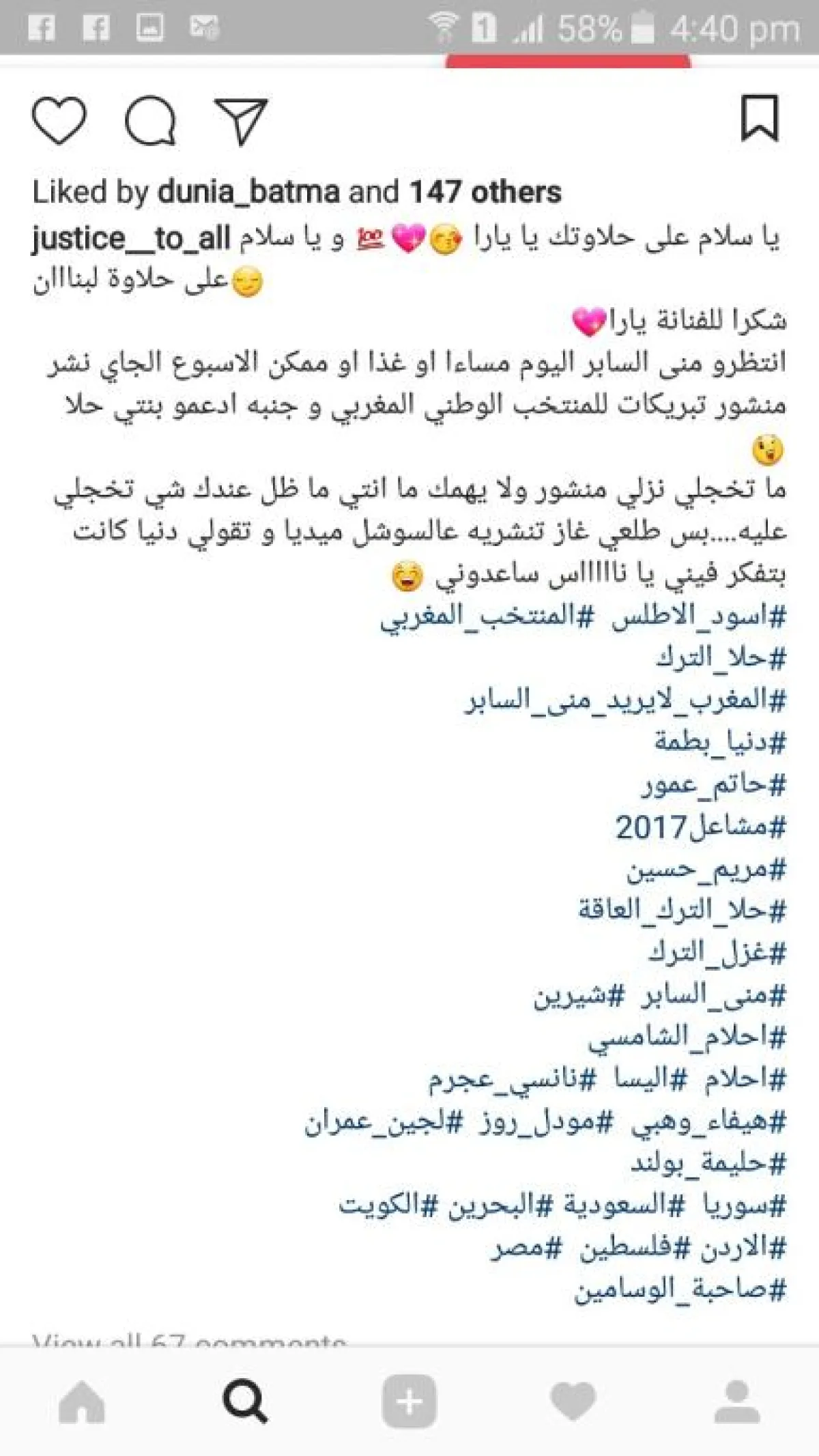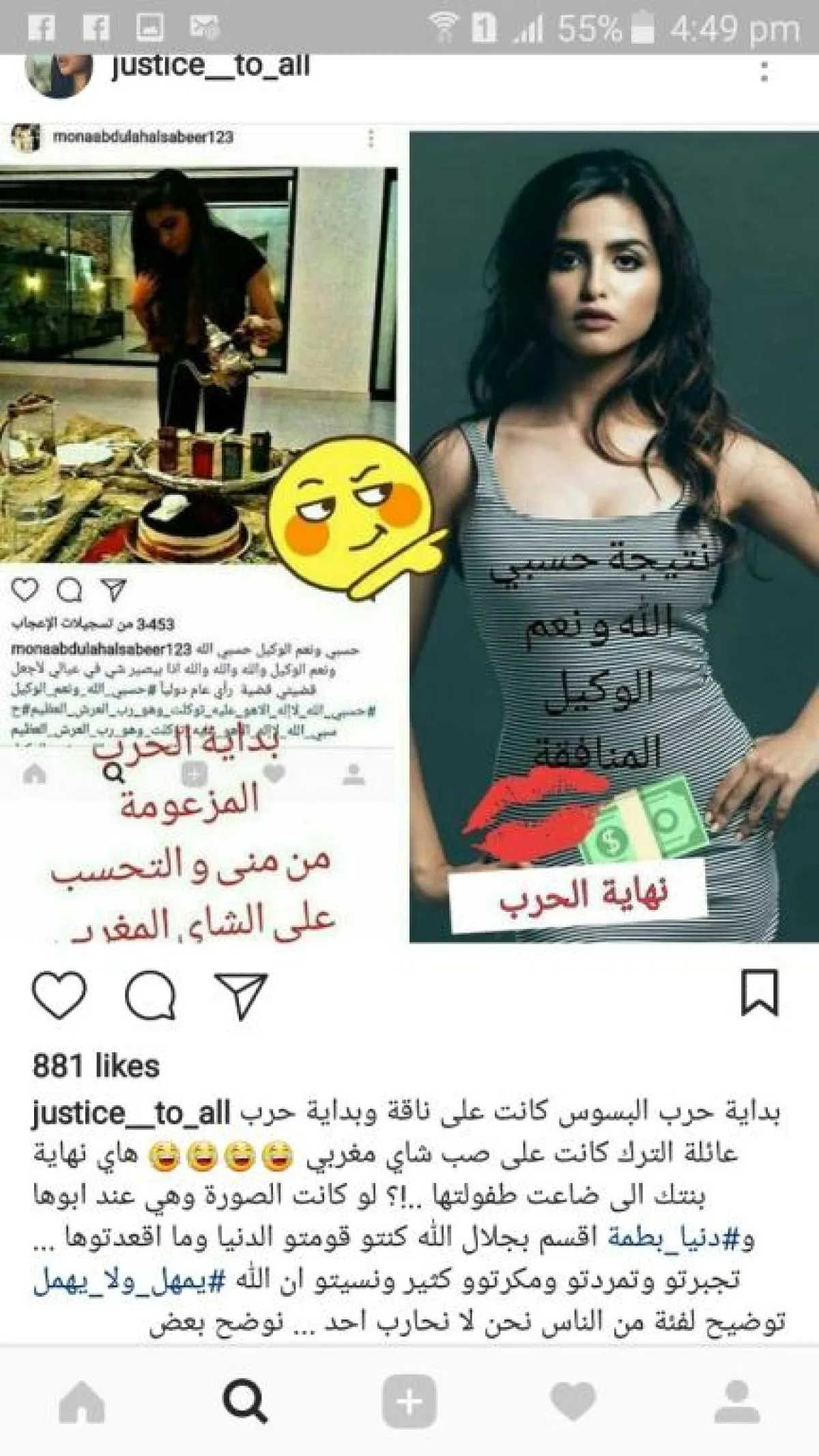 تبين أن الفنانة المغربية دنيا بطمة تستخدم حساباً وهمياً على "انستقرام" تحت اسم justice _to_all، تستخدمه خصيصاً لمهاجمة حلا الترك ووالدتها منى السابر.