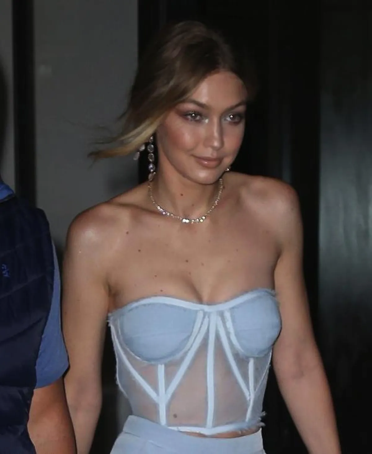أما "جيجي حديد" Gigi Hadid فقد اختارت اطلالة ناعمة باللون الأزرق الفاتح، عبارة عن كورسيه نسقتها مع سروال بخصر عالٍ، وزينت اللوك بمجوهرات ناعمة.