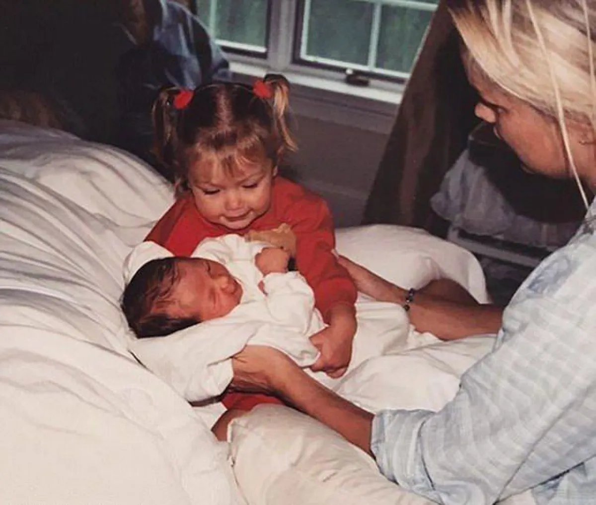 وظهرت جيجي في الصورة جالسة على سرير وتحمل بين يديها شقيقتها بيلا، وإلى جانبهما والدتهما يولندا فوستر Yolanda Foster، التي بدورها نشرت أيضًا صورة مميزة من طفولة بيلا.