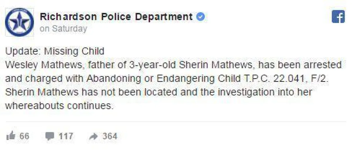 وأصدرت السلطات معلومات عن الطفلة، وأوضحت أن على مَن يجدها الاتصال بالرقم التالي: 972-744-4800.