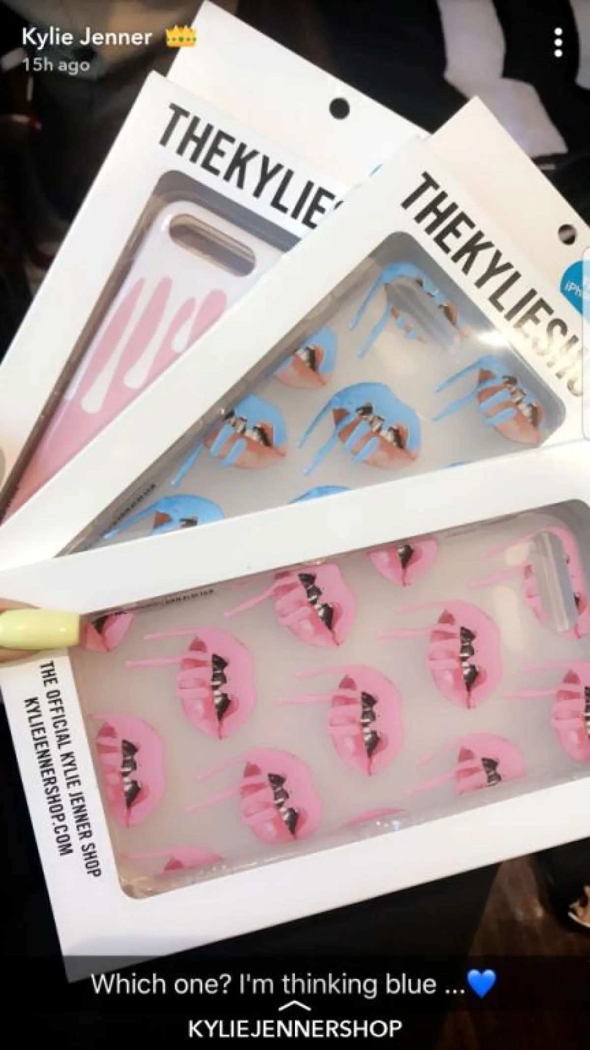 فقد نشرت كايلي البالغة من العمر 20 عامًا، صورة لأحمر شفاهها من علامتها الخاصة باللونين الأزرق والوردي، عبر حسابها الخاص على سناب شات، وأرفقت الصورة بتعليق كتبت فيه:" أي واحدٍ أختار؟ إنني أفكر باللون الأزرق".