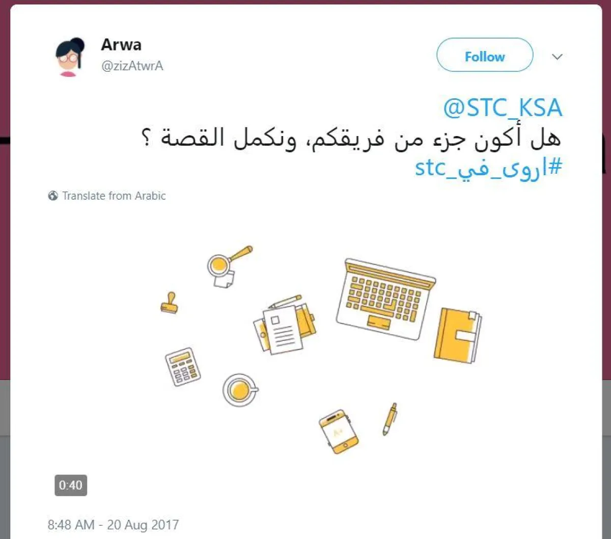 أروى الدواد: فتاة سعودية لجأت إلى طلب للتوظيف بصورة مبتكرة عبر حسابها في "تويتر"، ‏مدشنة هاشتاقاً بعنوان "أروى في‎ stc"، وعن طريق إبداعها وذكائها جعلت فرص العمل تنهال عليها من قبل الشركات، حيث نشرت مقطع فيديو عبر حسابها في موقع التدوينات القصيرة "تويتر" روت خلاله سيرتها الذاتية في مجال التسويق الرقمي.