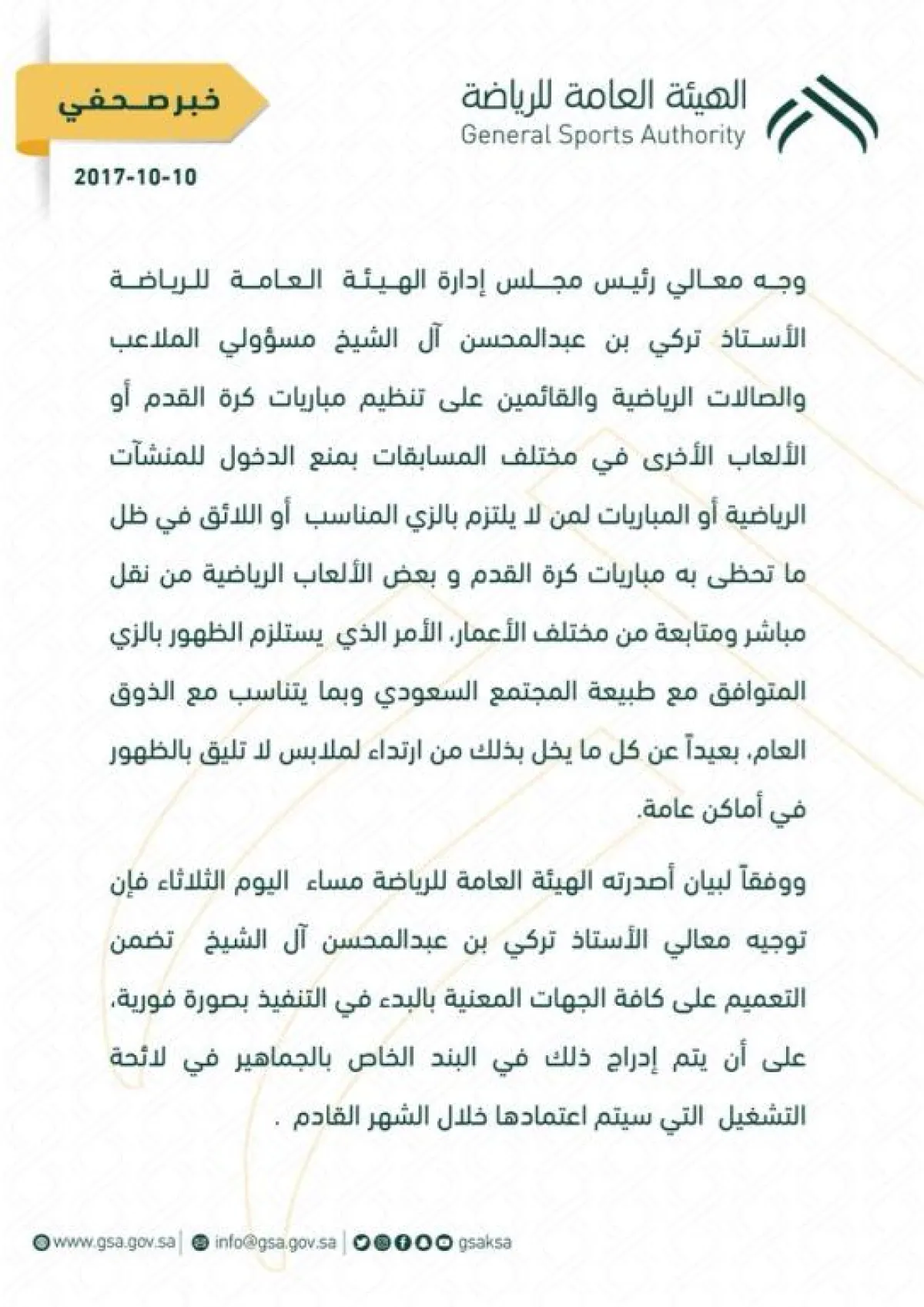 وجاء في البيان الذي نشرته "الهيئة": "وجَّه تركي بن عبدالمحسن آل الشيخ مسؤولي الملاعب والصالات الرياضية والقائمين على تنظيم مباريات كرة القدم، والألعاب الأخرى في مختلف المسابقات، بمنع الدخول إلى المنشآت الرياضية، أو المباريات، كل مَن لا يلتزم بالزي المناسب، واللائق، في ظل ما تحظى به مباريات كرة القدم وبعض الألعاب الرياضية من نقلٍ مباشر، ومتابعةٍ من مختلف الأعمار، الأمر الذي يستلزم الظهور بزي متوافق مع طبيعة المجتمع السعودي، ومتناسب مع الذوق العام، والابتعاد عن كل ما يخل بذلك بارتداء ملابس لا تليق بالظهور في الأماكن العامة".