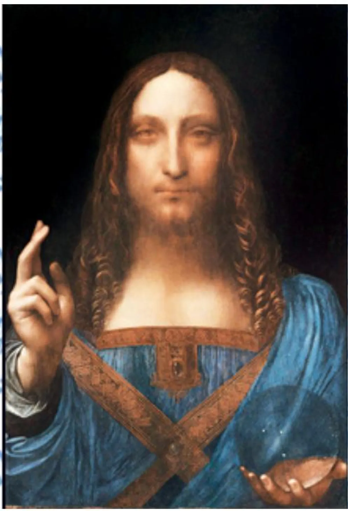 اللوحة التي يفترض أنها تمثل المسيح عليه السلام، تظهره في وضعية «سالفادور مندي» وهي الوضعية التي تظهره وهو رافع يده اليمنى وفي يده اليسرى كرة زجاجية يعلوها صليب.