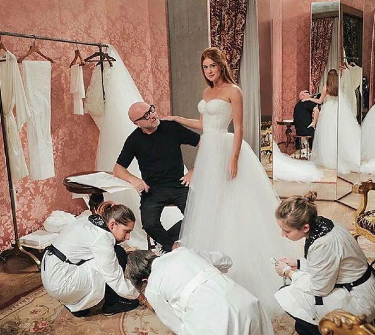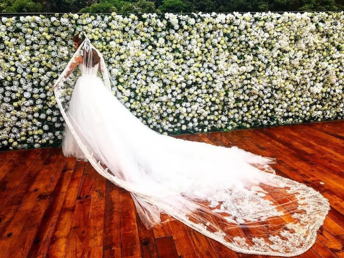 أما اطلالة العروس فمن توقيع المصمم العالمي دولتشي أند غابانا، وكتبت على صفحتها في انستقرام للمصممين: "ستيفانو ودومينيكو، أنتما صنعتما فستان زفاف أحلامي، وفاق توقعاتي، لا يمكنني أن أصف لكما شعوري حين رأيت الرداء الأبيض".