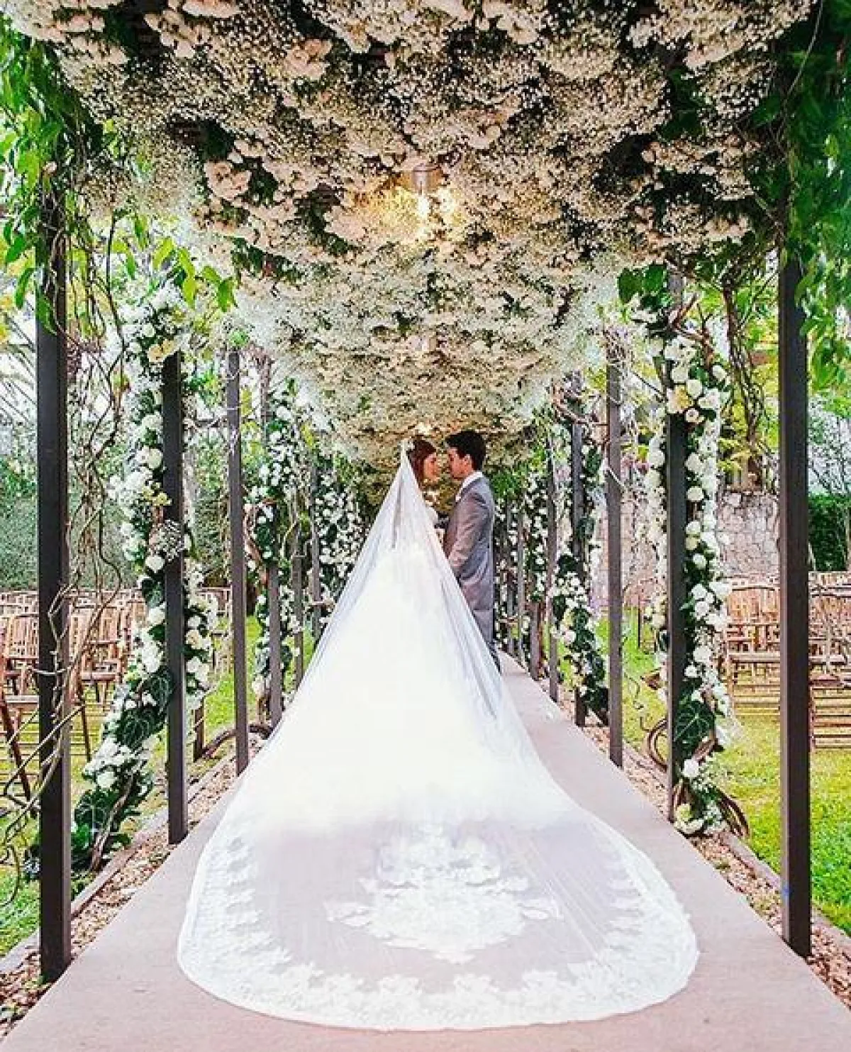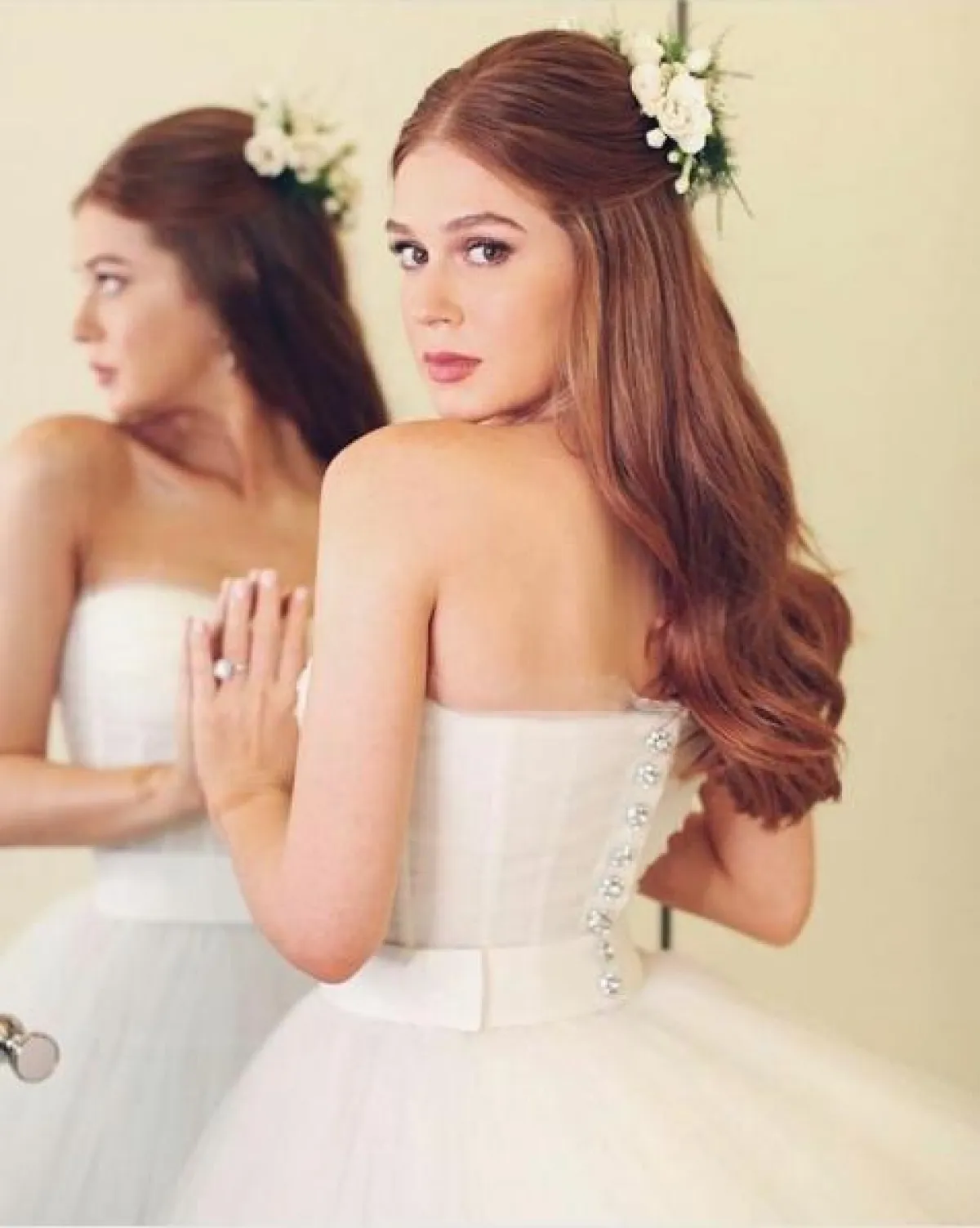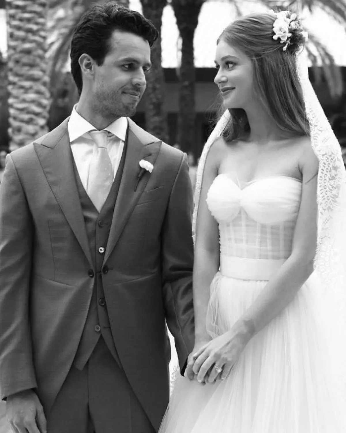 أثناء مراسم الزواج الرسمية، ارتدت العروس طرحة طويلة مطرزة، وعند بدء الاحتفال أطلّت العروس بتسريحة نصف شينيون مزينة بأكسسوار من الورد الأبيض.