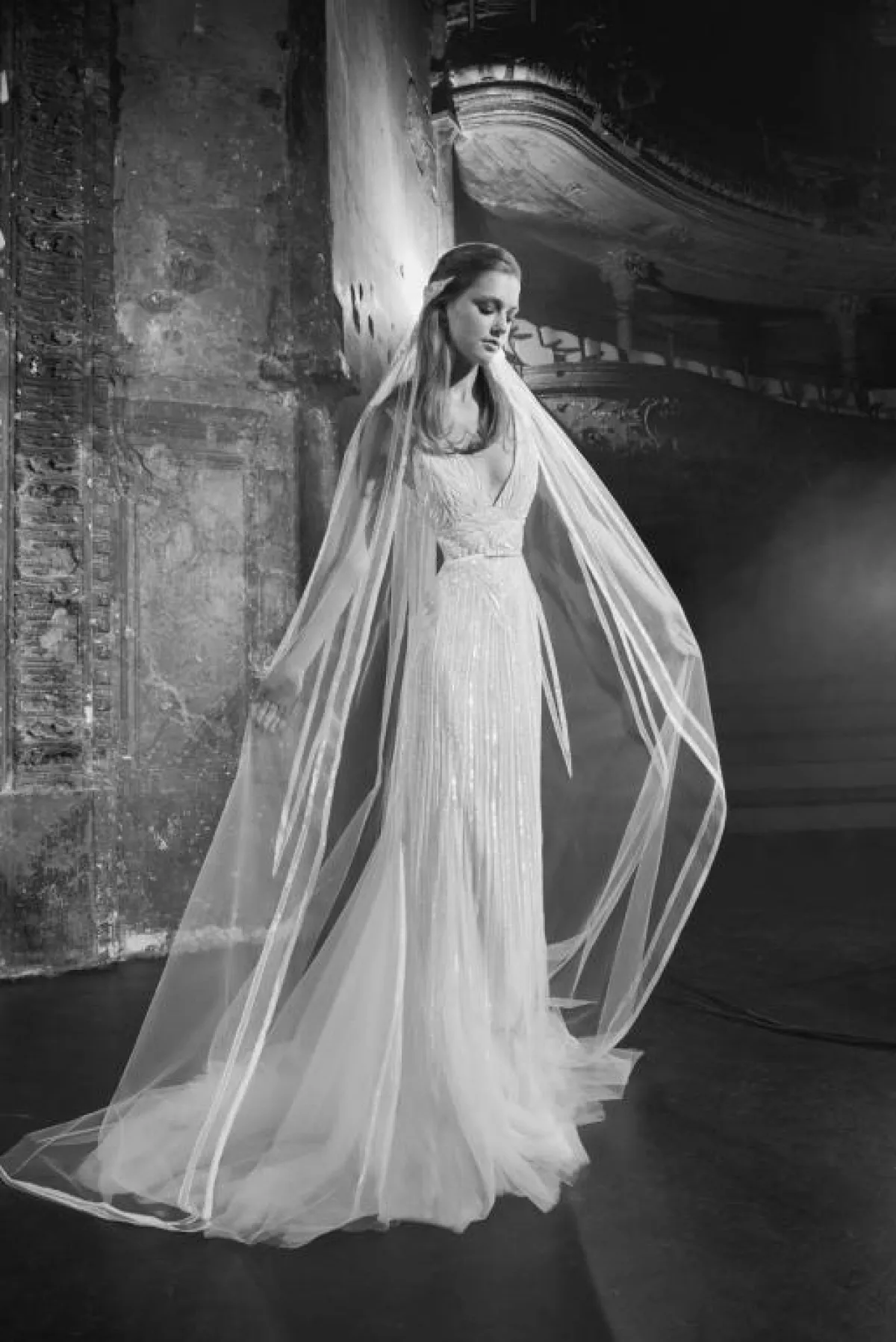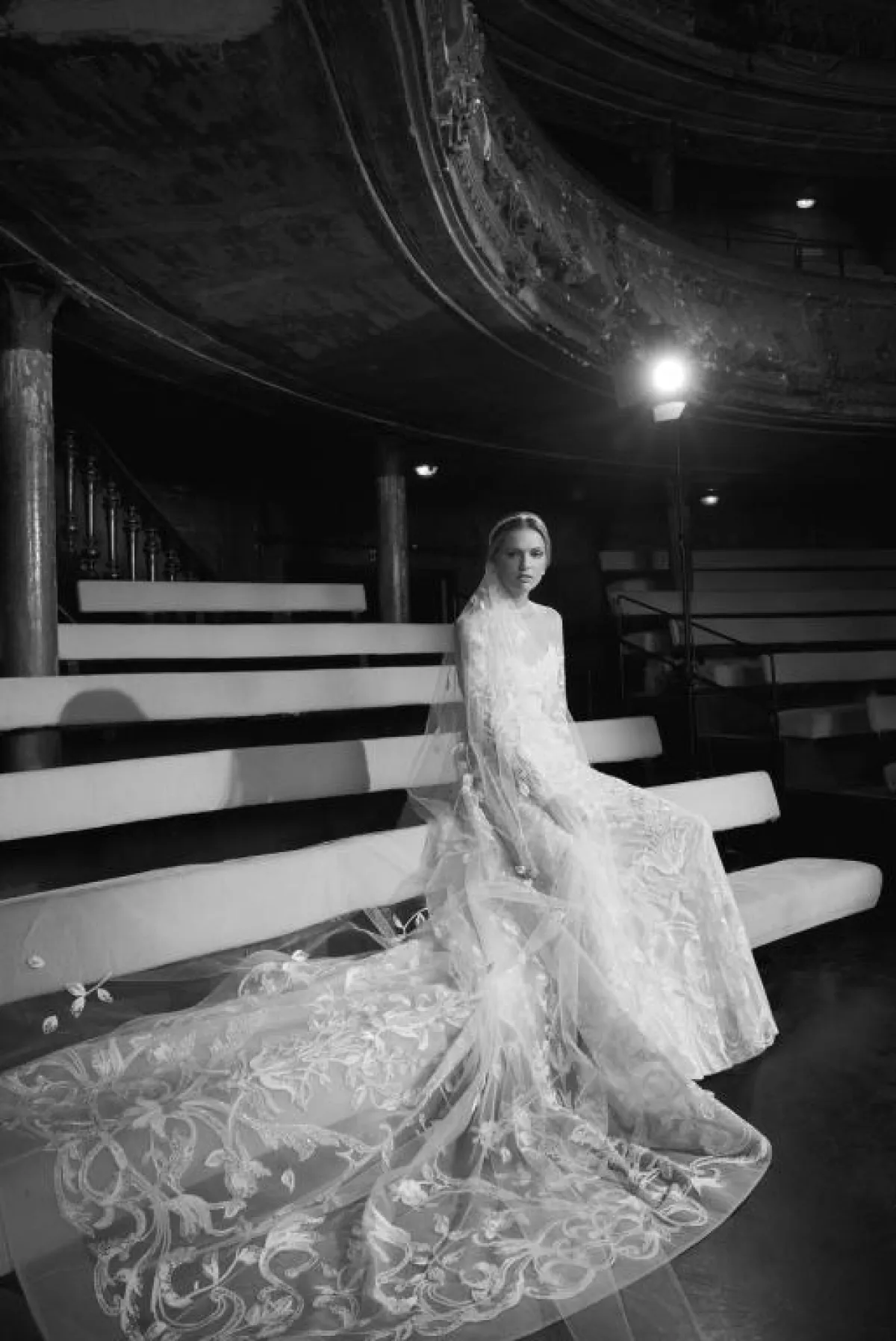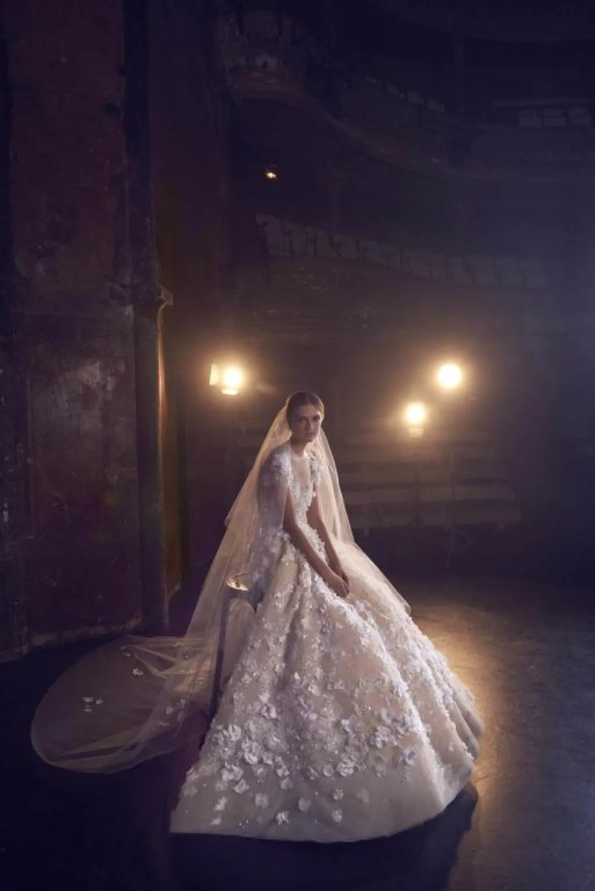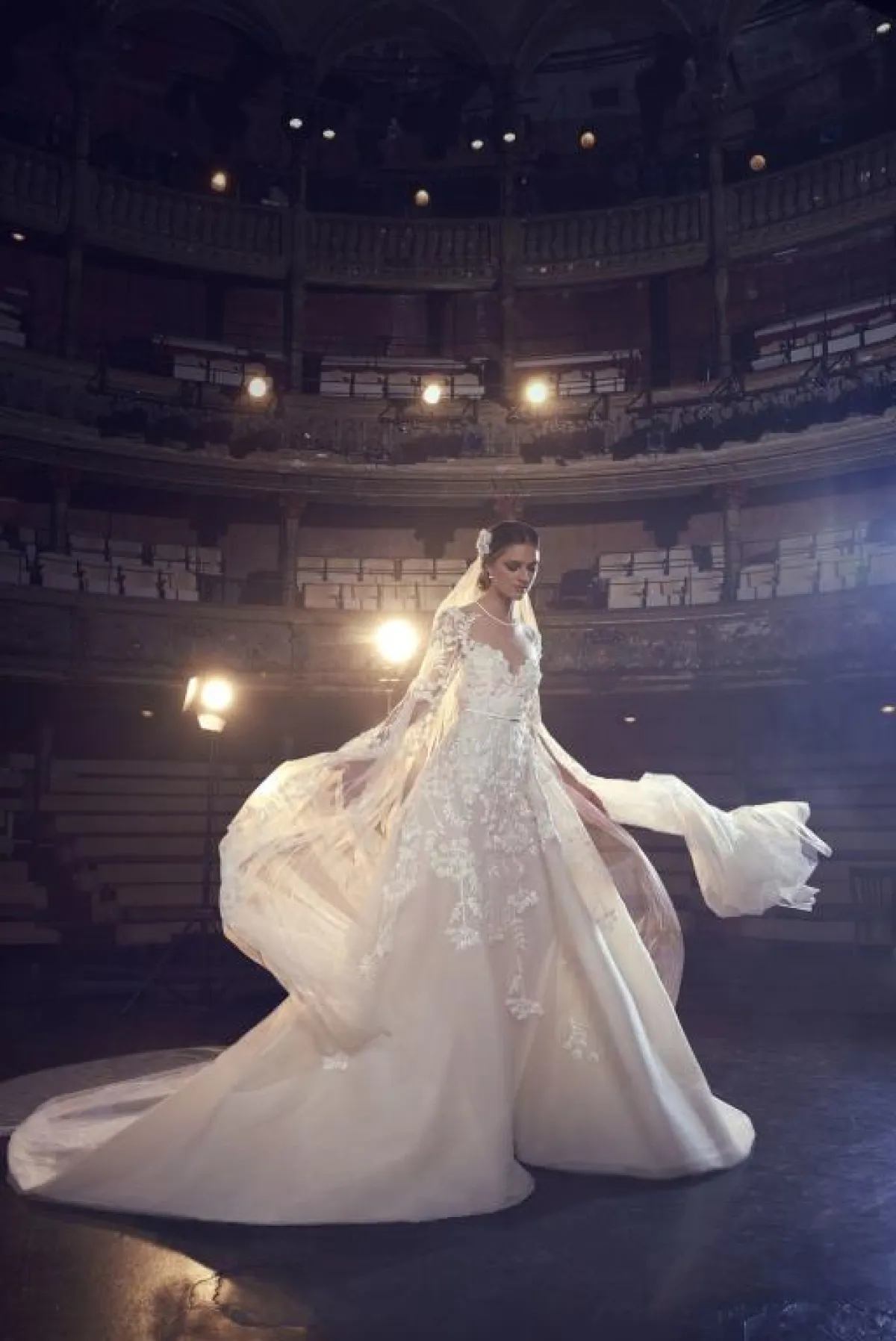 تشرق عروس إيلي صعب على خشبة المسرح، وتسلّط عليھا الأضواء، فتبدو متلألئة بالتطریزات والترصیعات فوق الساتان الناحت وطبقات الدانتیل الغنیة.