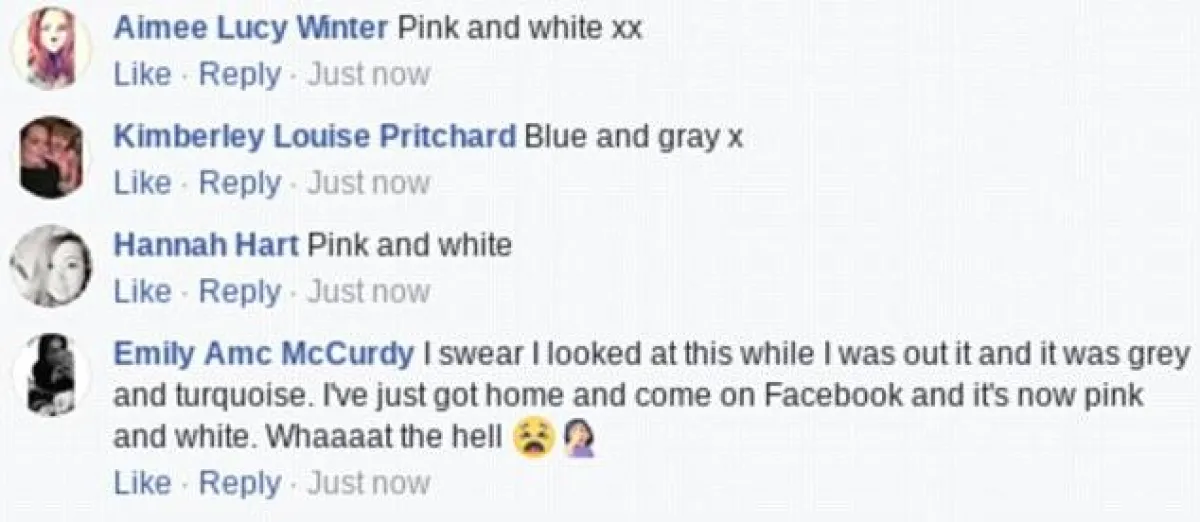 وذكرت أنها تراه زهريًّا مع أبيض، في حين يراه بعض أصدقائها باللون الأزرق الفاتح مع الرمادي الفاتح.