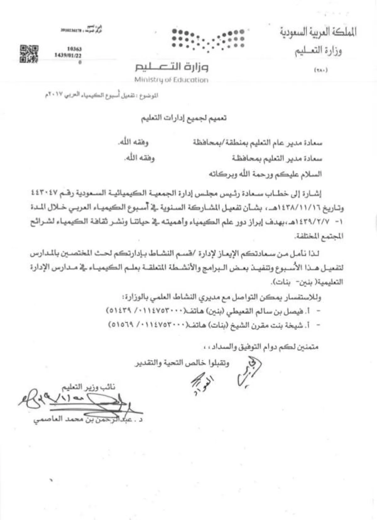 اعتمدت وزارة التعليم تفعيل مناشط الأسبوع العربي للكيمياء رسمياً في مدارسها كافة "بنين وبنات" في هذا العام الدراسي 1439هـ، بدءاً من الأول من شهر صفر وحتى السابع منه، حيث أصدر نائب وزير التعليم تعميماً إلى جميع إدارات التعليم في السعودية بتفعيل أسبوع الكيمياء كأحد المناشط الغير صفية لطلاب المدارس في جميع المراحل الدراسية.