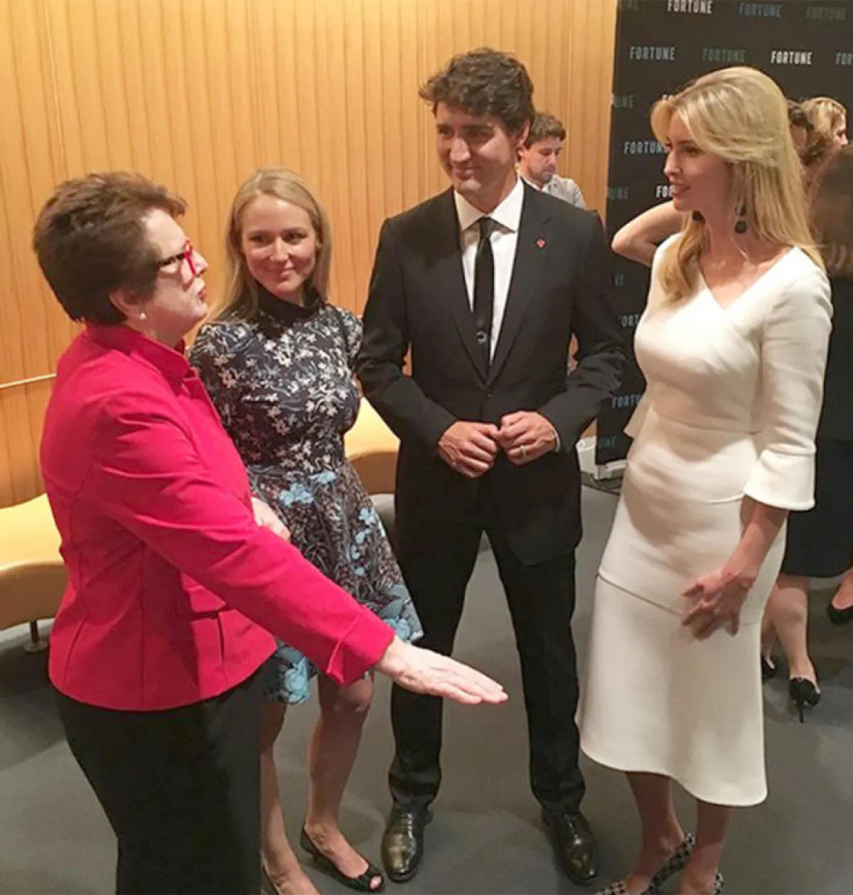 وظهرت إيفانكا خلال حفل عشاءٍ على هامش قمة النساء الأكثر ثراء في فورتشن وغالا بجانب رئيس الوزراء الكندي جاستن ترودو وزوجته. في غاية السعادة وهي ترتدي فستاناً أبيض ضيقاً وطويلاً مع قصة جانبية على الرقبة، ونسّقته مع حذاءٍ نسائي أنيق باللونين الأبيض والأسود، واكملت اطلالتها بمكياج ناعم وتسريحة بسيطة.
