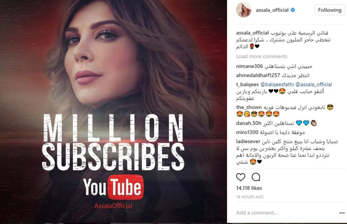 احتفلت الفنانة السورية أصالة عبر حسابها الرسمي بموقع إنستقرام بتخطي قناتها الرسمية على اليوتيوب حاجز المليون مشترك، شاكرةً الجمهور على دعمه الكبير لها وكتبت أصالة : القناة الرسمية للفنانة أصالة على يوتيوب تتخطى حاجز المليون مشترك .. شكراً لدعمكم الدائم.