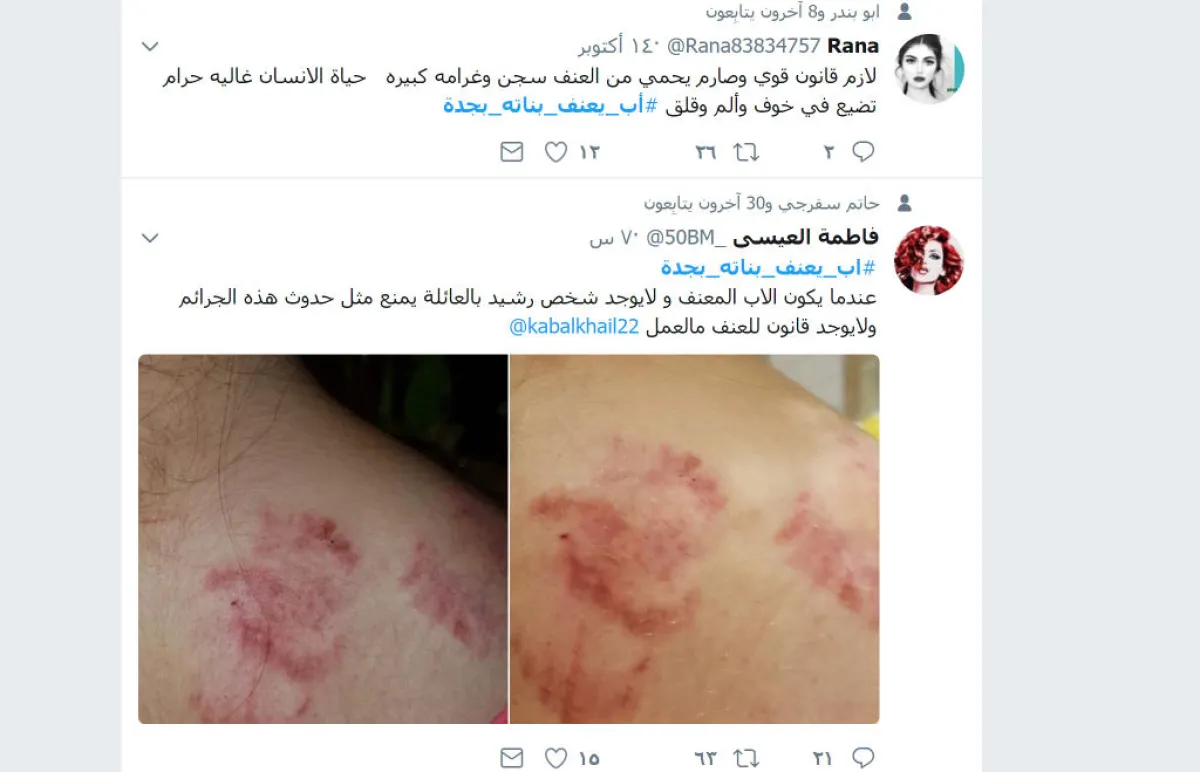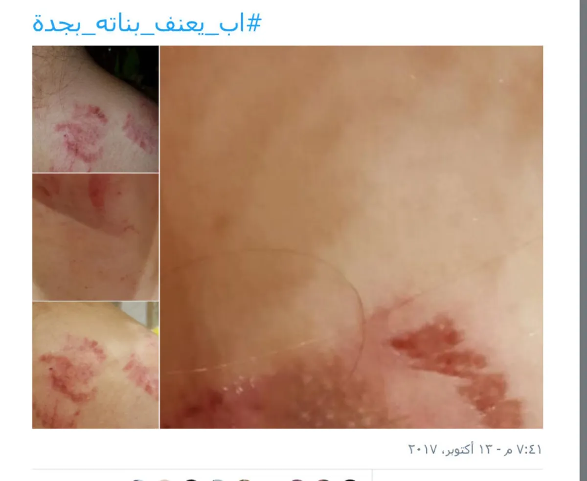 ووجدت الصور والتغريدات تفاعلاً لافتاً بين النشطاء على موقع "تويتر"، الذين طالبوا بالنظر إلى ما تردد عبر هاشتاق "#اب_يعنف_بناته_بجدة"، والصور المرفقة التي لم تتضح هل هي إصابات ضرب أم "عض"؟