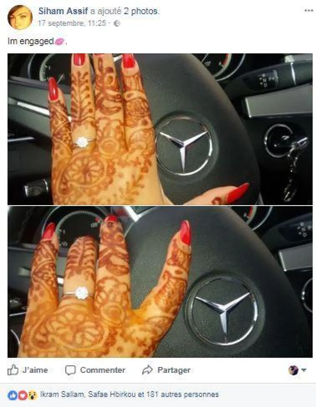 وتتضمن الصورتان يد الفنانة المذكورة منقوشة بالحناء تبعًا للتقاليد المغربية، وخاتمًا للزواج، وأرفقتهما بتعليق باللغة الانكليزية كتبت فيه: "لقد ارتبطت".