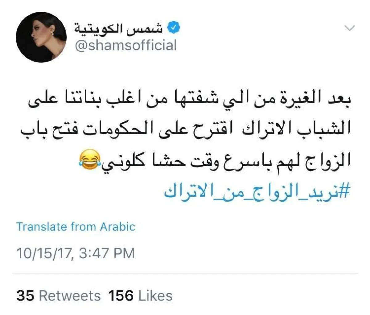 ثم عادت شمس وأطلقت تغريدة فيها نوع من السخرية قالت فيها : "بعد الغيرة اللي شفتها من أغلب بناتنا على الشباب الأتراك، اقترح على الحكومات فتح باب الزواج لهنّ بأسرع وقت، حشا كلوني".