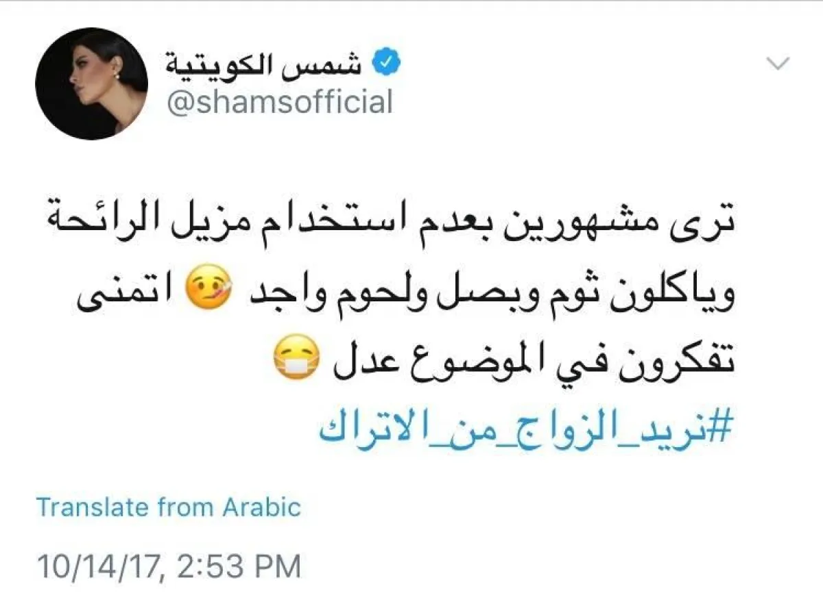 وقالت شمس في تغريدتها : "ترى مشهورين بعدم استخدام مزيل الرائحة، ويأكلون الثوم والبصل واللحوم وايد (كثيرًا)، اتمنى تفكرون في الموضوع عدل".