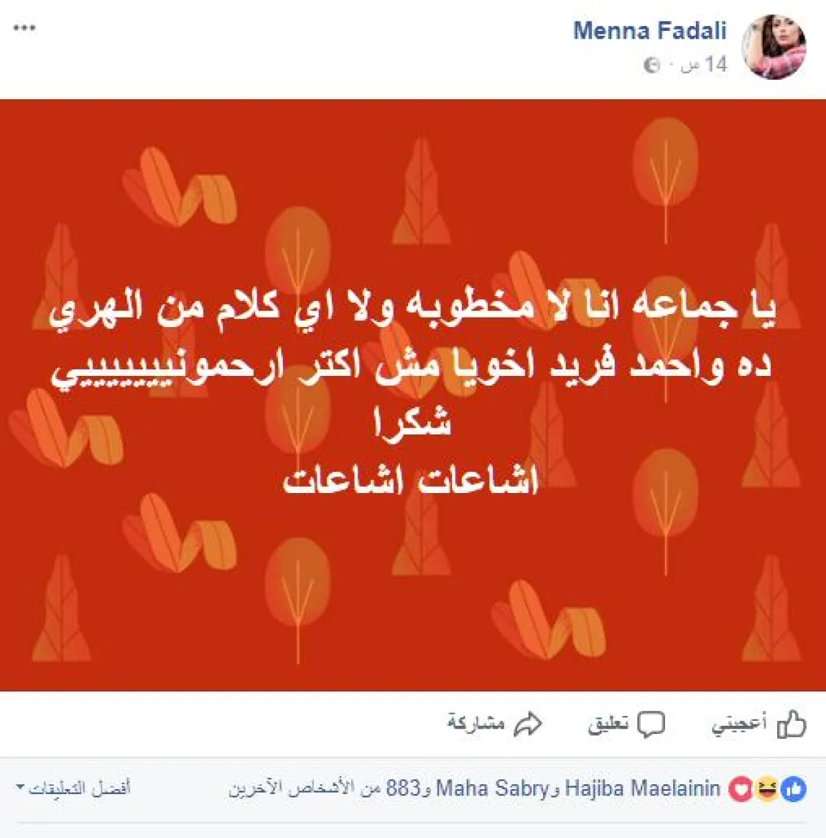 ولنفي أي شائعة مقبلة قالت: يا جماعة أنا لا مخطوبة ولا أي كلام من الهري ده.. وأحمد فريد أخويا مش أكتر.. أرحموني شكرًا.. شائعات شائعات.