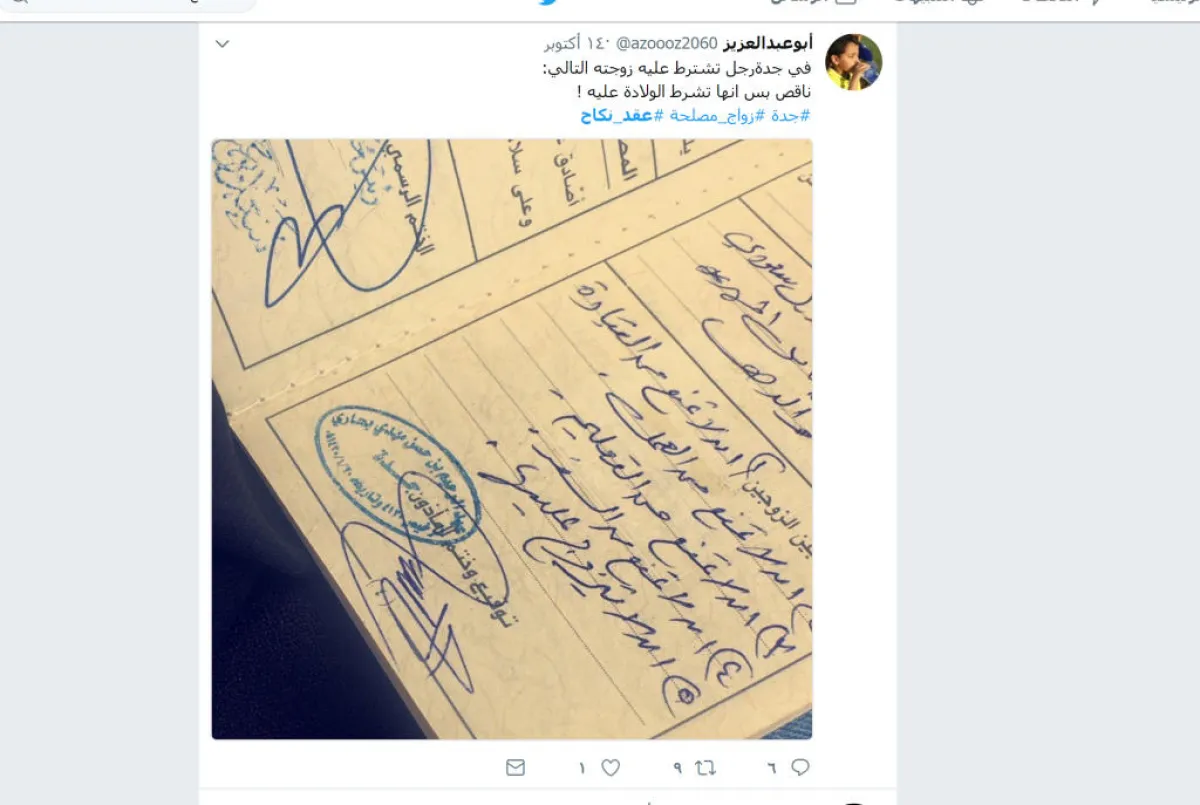 تداول نشطاء في موقع التواصل الاجتماعي "تويتر" صورة لشروط عقد نكاح، أثارت جدلاً واسعاً بين المغردين، وكذلك في مجموعات "واتسآب"، حيث اشترطت الزوجة على زوجها عدم الزواج من امرأة أخرى، الأمر الذي اتفق معه عديد من الأشخاص، فيما رفضه آخرون بشكل قاطع.