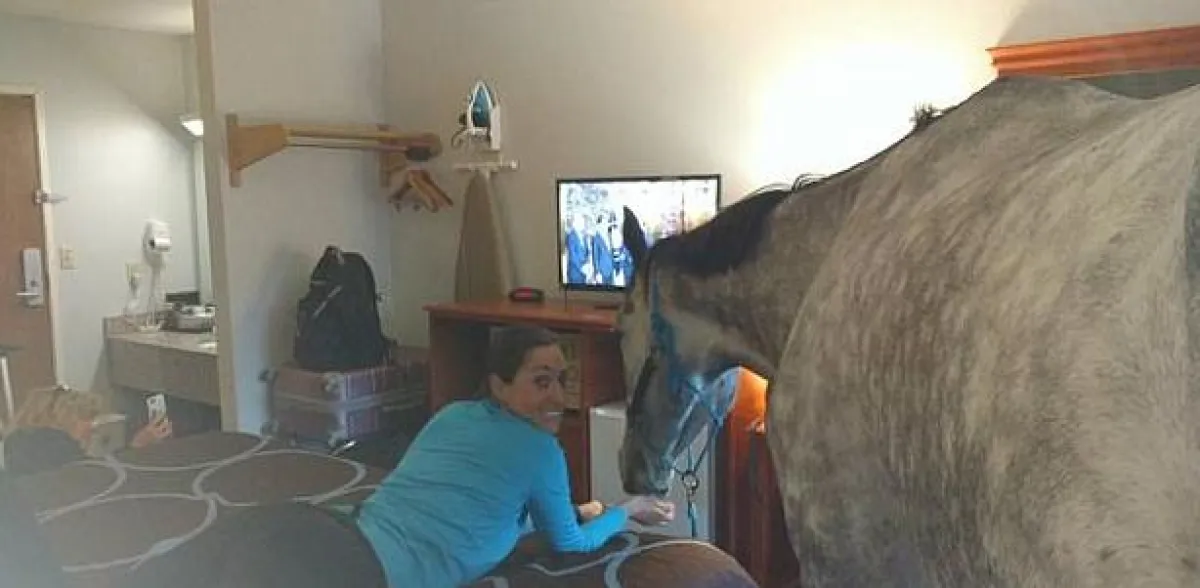 وقامت السيدة ليندسي بارتريدج، من بونتيبول، باصطحاب فرسها الرمادي Blizz إلى فندق Super 8 في منطقة جورج تاون.