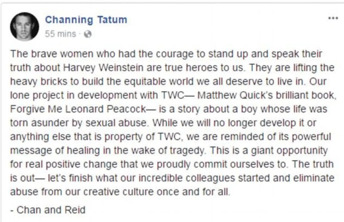 في خطوة انسانية لافتة، وتضامنًا مع الضحايا من النساء، أعلن الممثل الأمريكي تشاننغ تاتوم Channing Tatum انسحابه من فيلم من إنتاج هارفي واينستين Harvey Weinstein، بعد موجة الاتهامات بالتحرش والاعتداء الجنسي التي يواجهها الأخير حاليًّا.