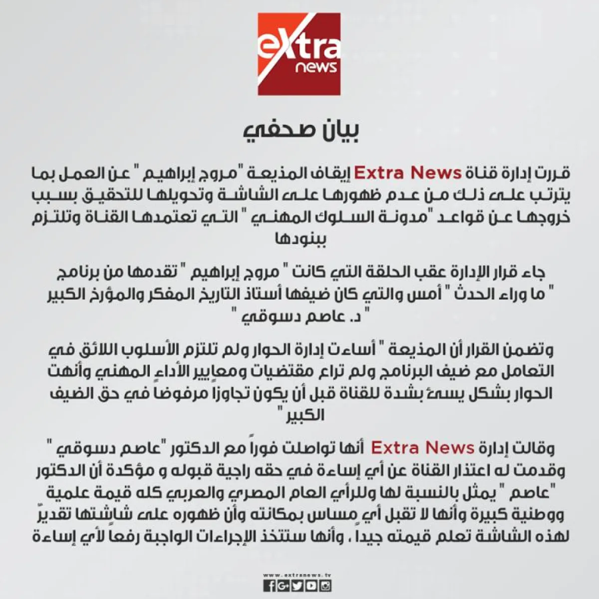 قرّرت إدارة قناة "إكسترا نيوز" المصرية إيقاف الإعلامية المصرية مروج إبراهيم عن العمل وتحويلها للتحقيق بسبب خروجها عن قواعد مدونة السلوك المهني التي تعتمدها القناة ، وذلك على خلفية إهانة المذيعة لضيفها أستاذ التاريخ الكبير عاصم الدسوقي على الهواء وإنهاء الحوار معه.