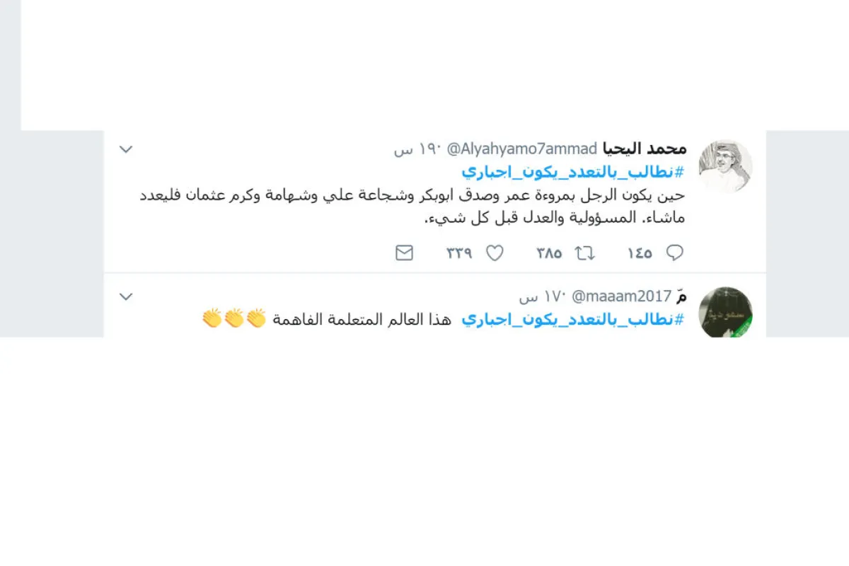 شهد هاشتاق بعنوان "#نطالب_بالتعدد_يكون_إجباري" على موقع التواصل الاجتماعي "تويتر"، جدلاً وتفاعلاً واسعاً، كما أثار دهشة كثير من السيدات والفتيات، اللواتي تضامن بعضهن مع المطالِبات بالتعدُّد، مؤكدات بأنه مقترح جدير بالتنفيذ للقضاء على مشكلة العنوسة التي زادت مؤخراً في المجتمع السعودي.
