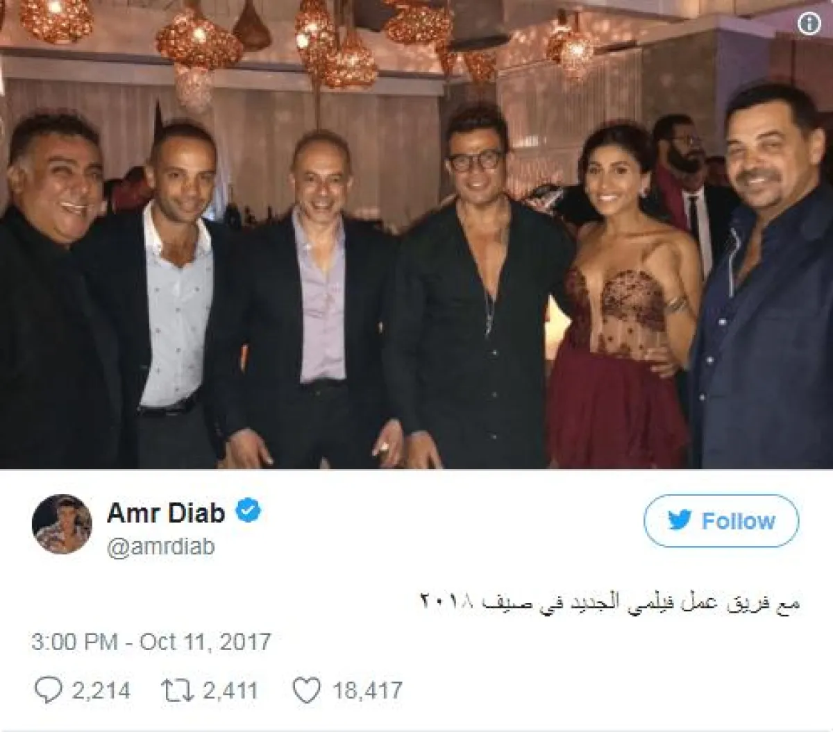 دياب أنهى إجراءات سفره بصحبة دينا على رحلة طيران دولة الإمارات العربية المتحدة رقم 926 والمتجهة إلى دبي وانتظرا بصالة الخدمة المميزة ــ كبار الزوار بمقابل رسوم مالية ــ لحين صعودهما إلى الطائرة، حيث حرص عدد من الركاب والعاملين بالمطار على مصافحة الهضبة والتقاط الصور التذكارية معه، بينما رفضت دينا الشربيني الظهور منعاً لتجدد أزمة عيد ميلاده حيث تسبب ظهورها في الحديث مجدداً عن زواجهما سراً واضطر عمرو وقتها لنشر صورة جماعية لمن وصفهم بـ "فريق العمل" مشيراً لاحتمال تقديم فيلم جديد قريباً سيكون من بطولة الشربيني.