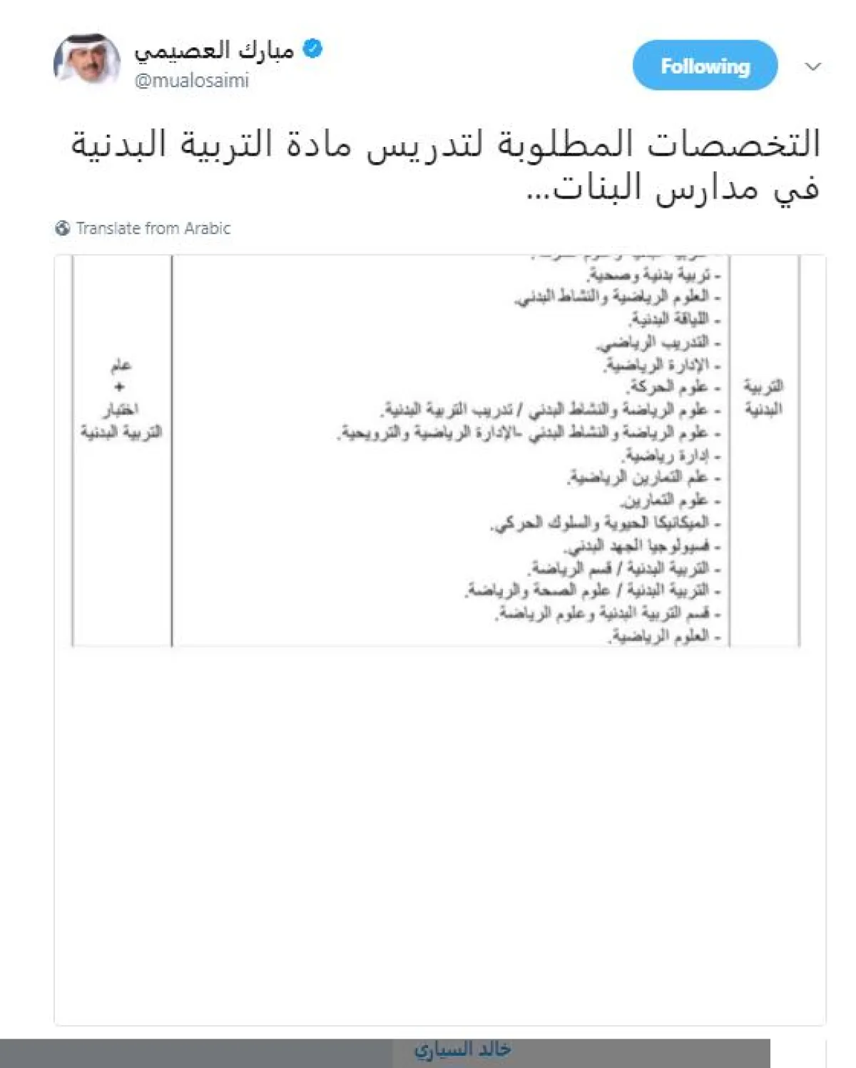 في حين، قال المغرد@quw_nawaf: "على فكرة يا أفاضل، معلمو البدنية أغلبهم من غير التخصص، فلماذا لا ينطبق هذا على المعلمات حتى تتوفر التخصصات المطلوبة؟".