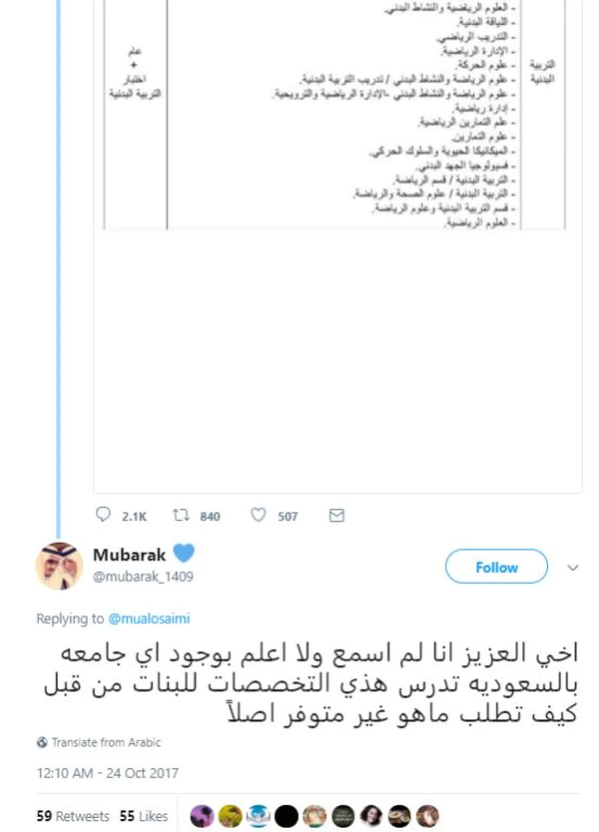 وتعليقاً على ذلك، قال المغرد @mubarak_1409: "أنا لم أسمع، ولا أعلم بوجود أي جامعة في السعودية تدرِّس هذه التخصصات للبنات من قبل. كيف تطلب ما هو غير متوفر أصلاً؟".