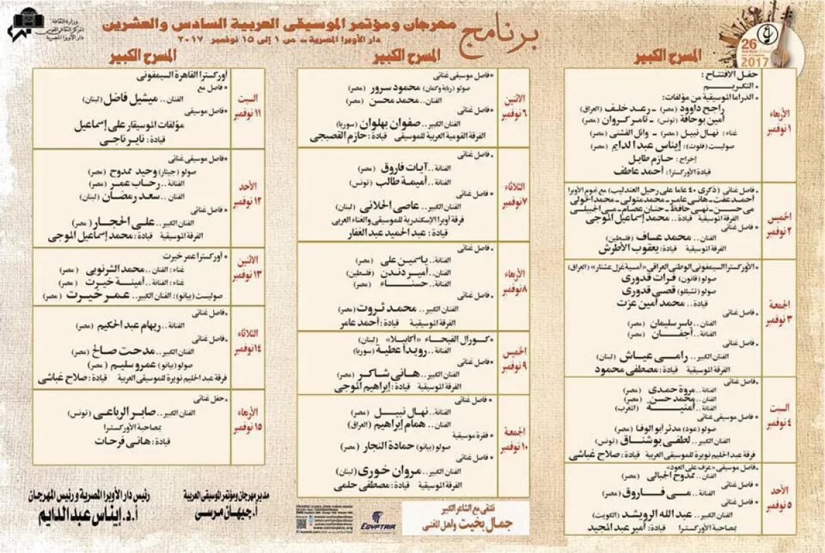 كشفت إدارة مهرجان الموسيقى العربية، عن القائمة النهائية لنجوم الدورة الـ26 المقرر افتتاحها يوم الأربعاء الأول من نوفمبر المقبل، وتضم: مروان خوري، وعاصي الحلاني، ورامي عياش من لبنان، وصابر الرباعي ولطفي بوشناق من تونس، ومحمد عساف من فلسطين، وصفوان بهلوان ومجد القاسم من سوريا، وهاني شاكر ومي فاروق ومحمد ثروت وعلي الحجار ومدحت صالح وأحمد جمال من مصر، وعبد الله الرويشد من الخليج، مع تخصيص حفل للموسيقار عمر خيرت، وحفل آخر للموسيقار اللبناني ميشال فاضل.