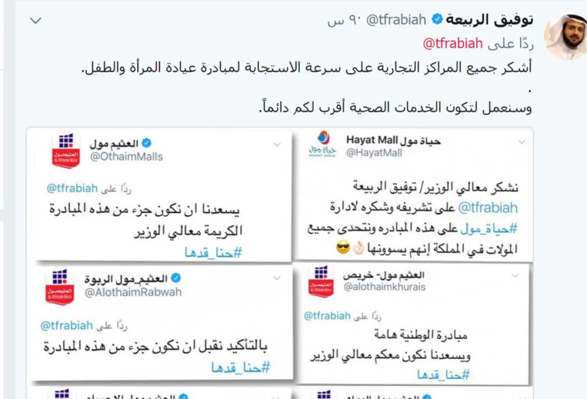 ودعا الربيعة بقية المراكز التجارية إلى تخصيص مساحات مماثلة، لتتسابق المولات التجارية في كافة أنحاء السعودية في التغريد بالمشاركة في الأمر، وتنهال الموافقات على المبادرة من قِبلها، وقد لاقت ترحيباً كبيراً من الدكتور الربيعة، الذي غرَّد بذلك رداً عليها، قائلاً: "أشكر جميع المراكز التجارية على سرعة الاستجابة لمبادرة عيادة المرأة والطفل، وسنعمل لتكون الخدمات الصحية أقرب لكم دائماً".