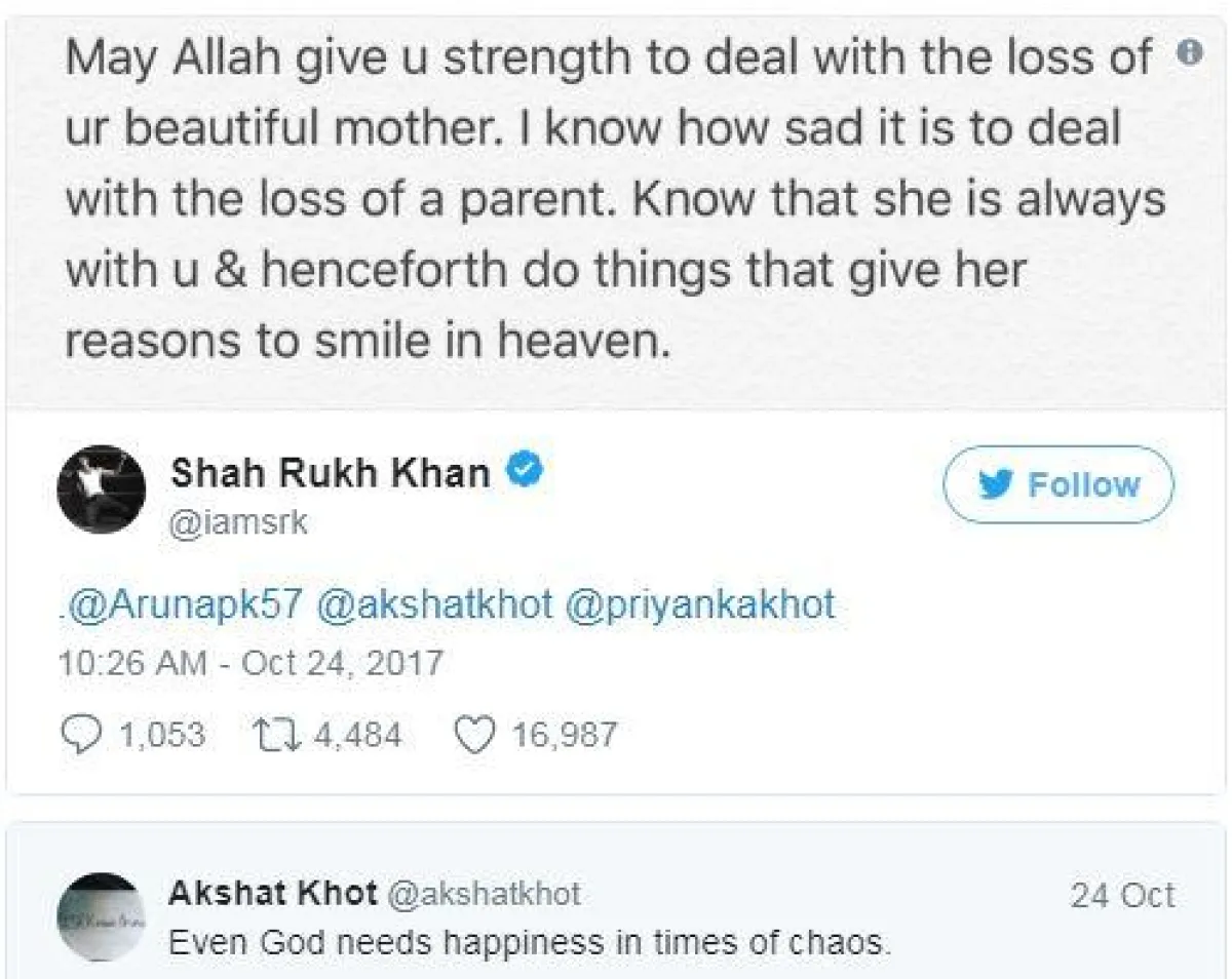 بدوره أعرب شاروخان عن حزنه العميق لرحيل أرونا قبل تحقيق أمنيتها الأخيرة، وغرّد من خلال صورة لها نشرها على حسابه الخاص في تويتر، وعلّق عليها بعبارات التعازي والمواساة لأبنائها على رحيل والدتهم بالقول: "أدعو لكم بالصبر
