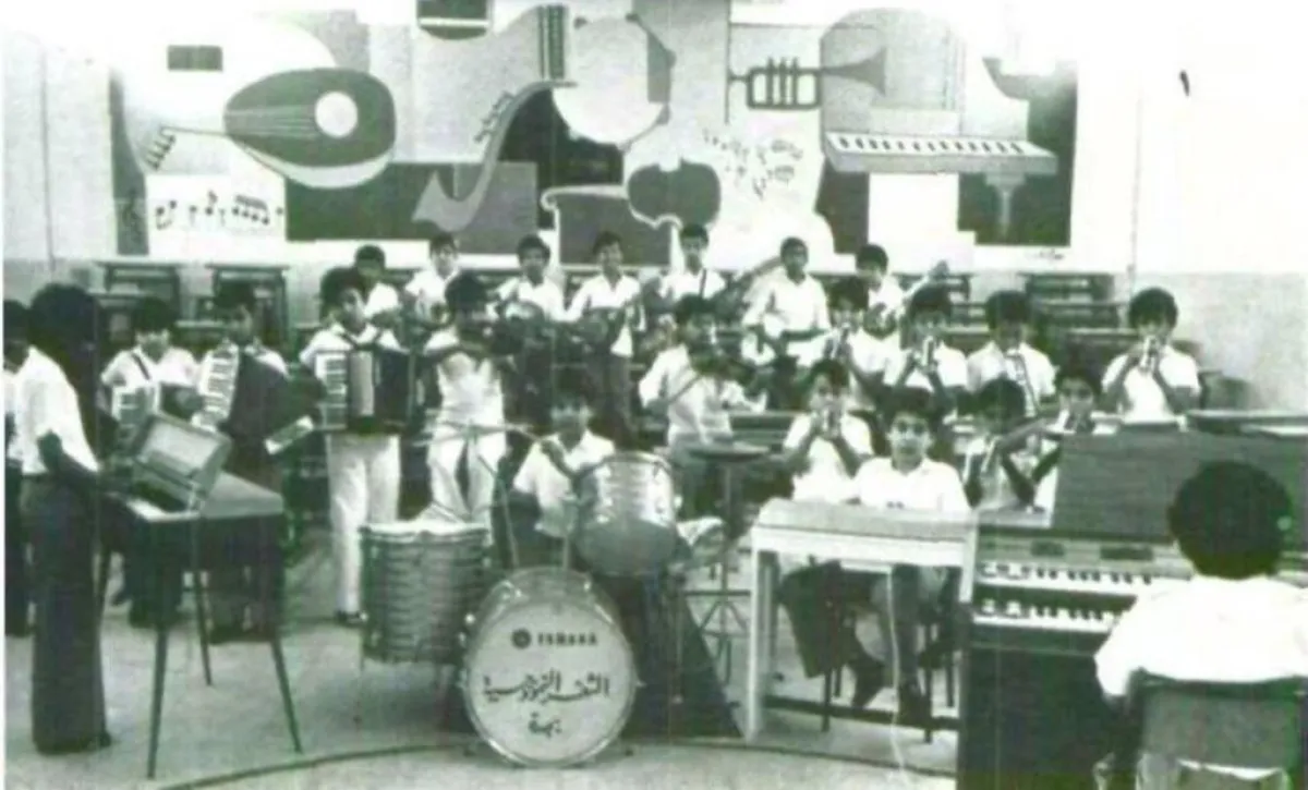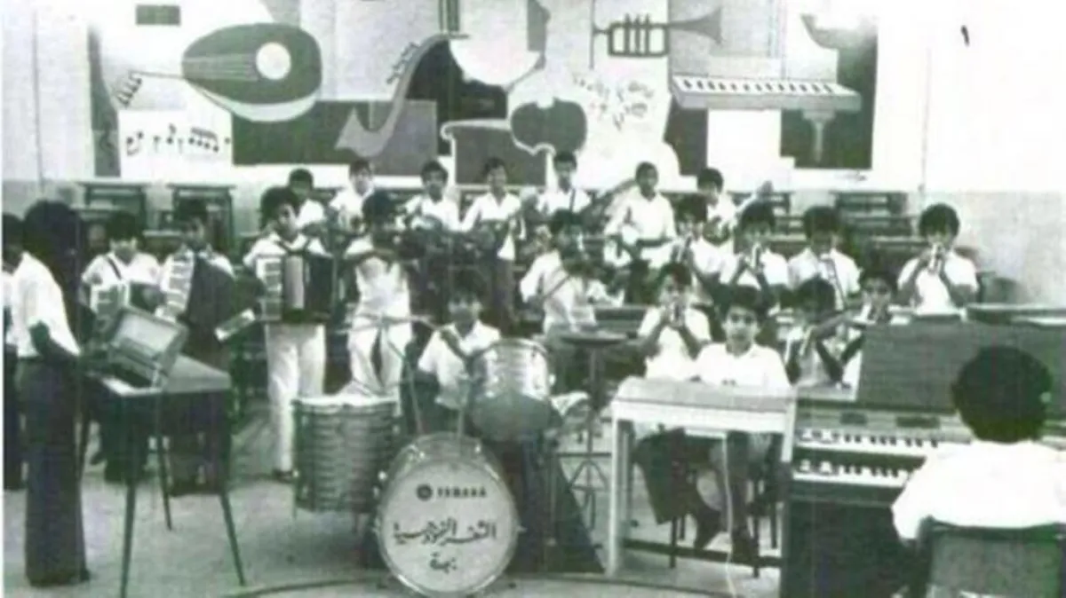 ويظهر في الصورة أكثر من 20 طالباً يعزفون على مختلف أنواع الآلات الموسيقية، كالبيانو والغيتار والربابة والطبل والدف والعازف، فيما يظهر خلف الطلاب جدارية كبيرة رسمت عليها أدوات موسيقية.