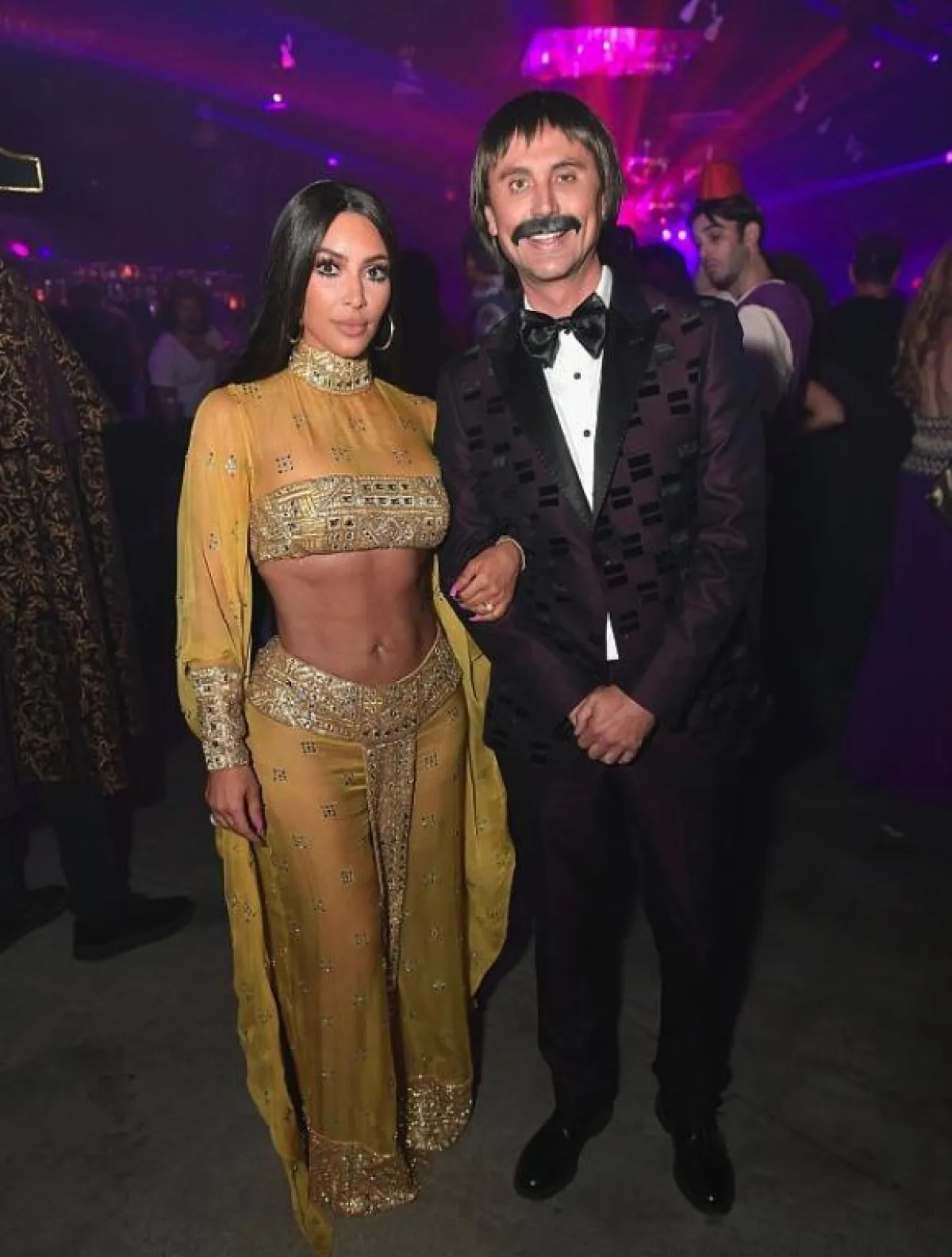 كما شاهدنا "كيم كارداشيان" Kim Kardashian وقد اختارت لوك مستوحا من نجمتها المفضلة "شير" Cher في السبعينات عبارة عن تصميم ذهبي يشبه الساري الهندي.