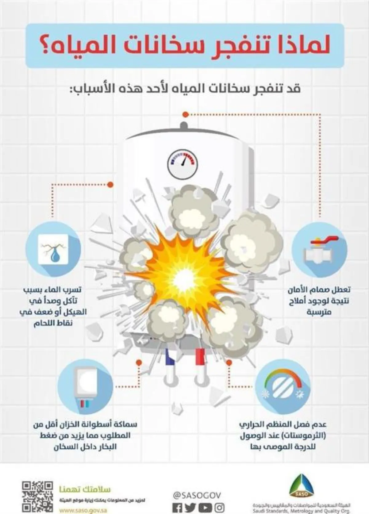 وقالت الهيئة إن من هذه الأسباب «تعطل صمام الأمان نتيجة الأملاح المترسبة، وكذلك حدوث تسرب الماء بسبب تآكل وصدأ في الهيكل أو ضعف بنقاط اللحام، وذلك من أهم أسباب انفجار سخانات المياه».