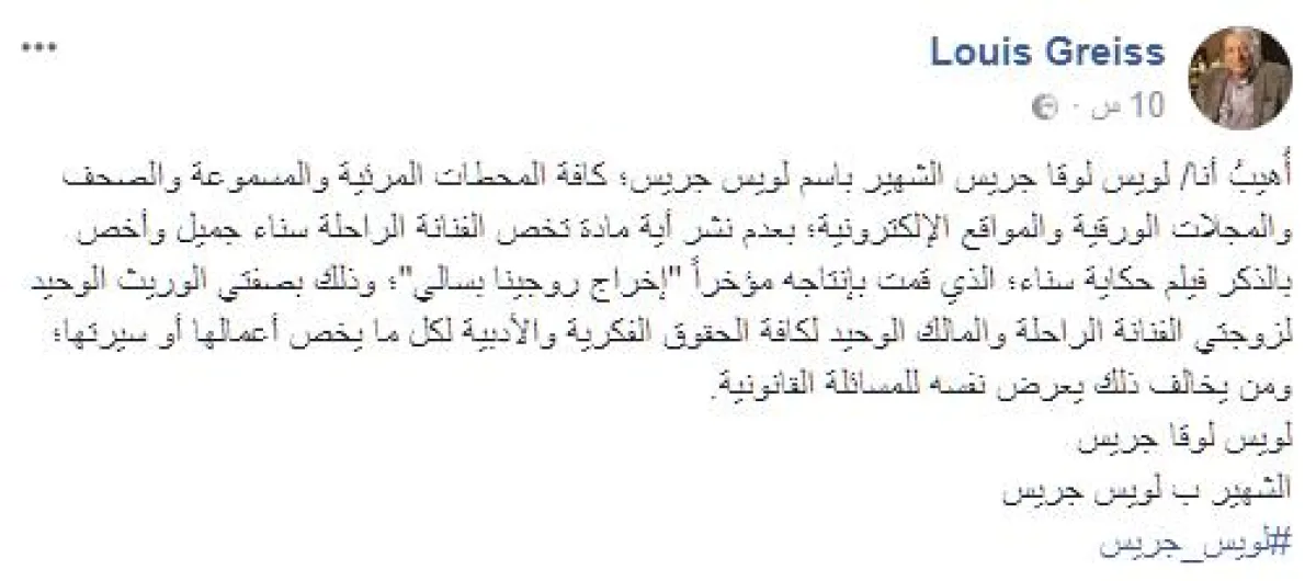 الكاتب الصحافي لويس جريس، أكد أنه الوريث الوحيد لزوجته الفنانة الراحلة، والمالك الوحيد للحقوق الفكرية والأدبية كافة لكل ما يخص أعمالها أو سيرتها، وحذّر من نشر أي كلمة عنها، مهددًا بأنّ من سيخالف ذلك يعرّض نفسه للمساءلة القانونية!!