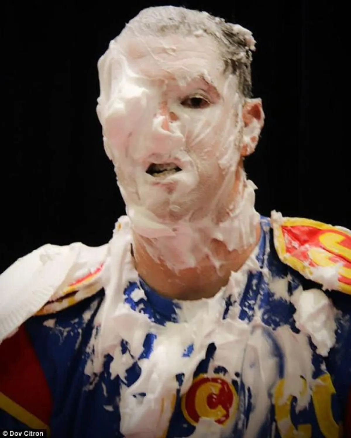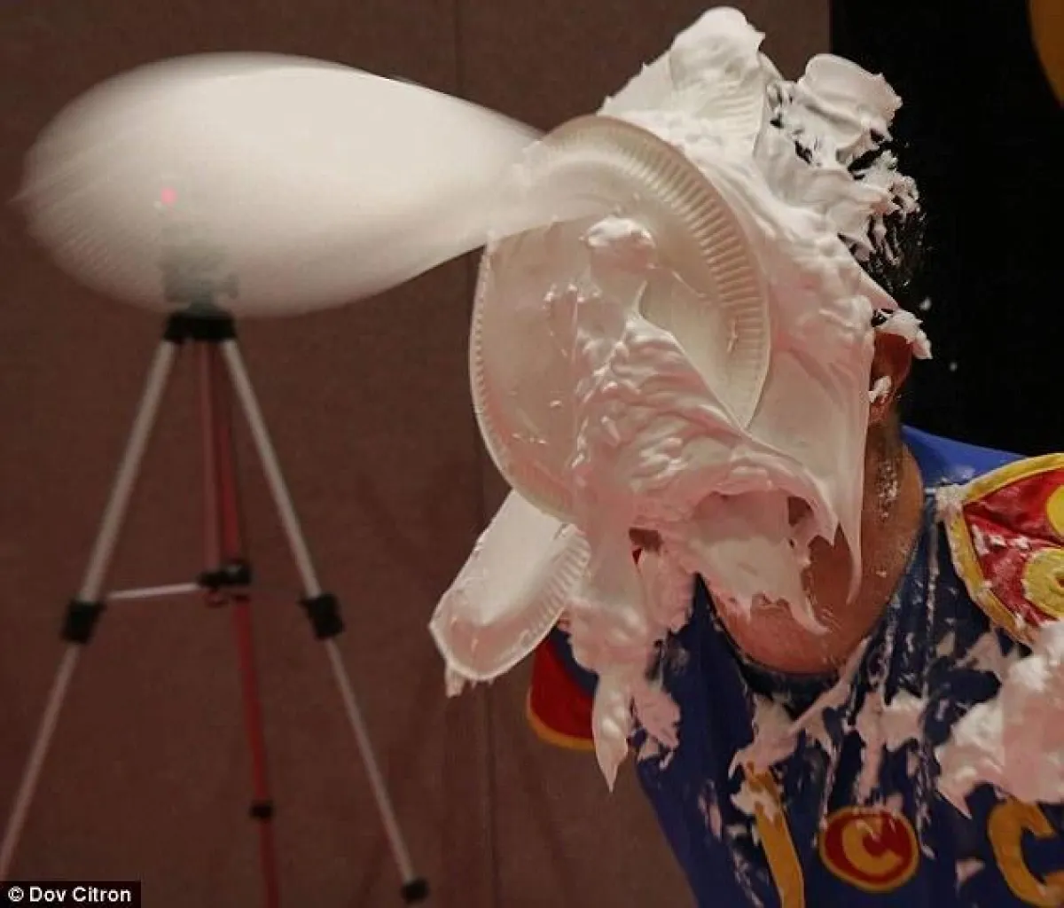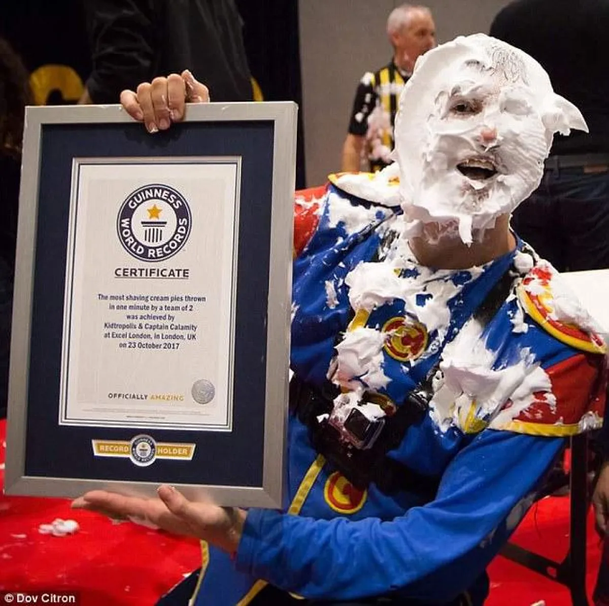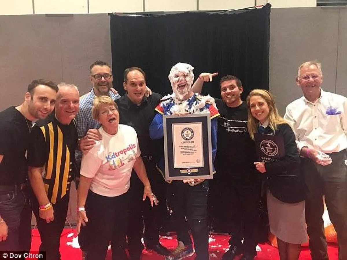وتمكن ديف سيترون من إلقاء 72 صحن رغوة حلاقة على وجه صديقه بول ميجرام، خلال دقيقة واحدة، ليكسرا بذلك الرقم القياسي السابق، وهو 71 فطيرة فقط، وذلك من مسافة تصل إلى متر ونصف.