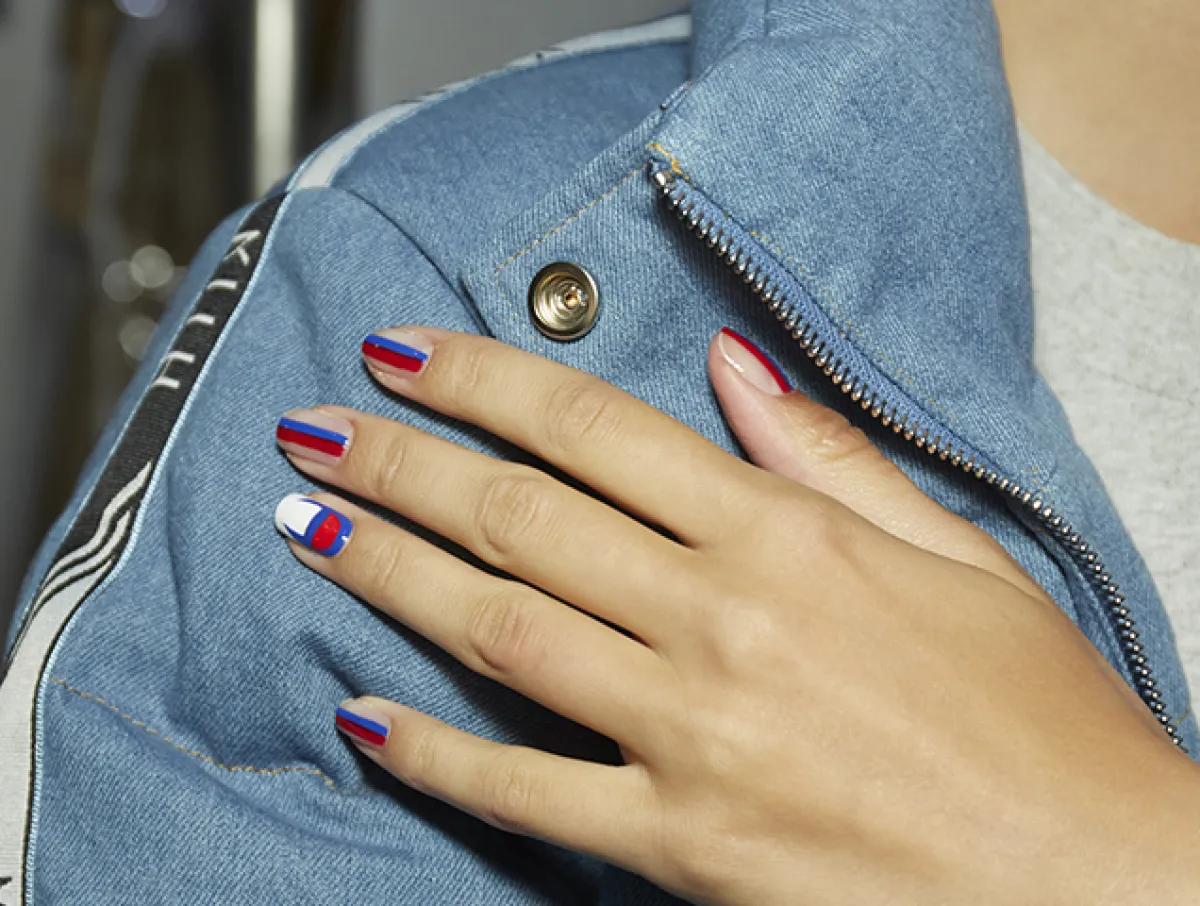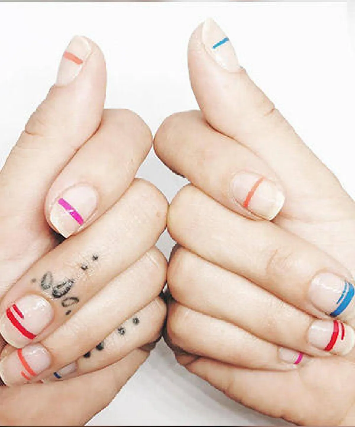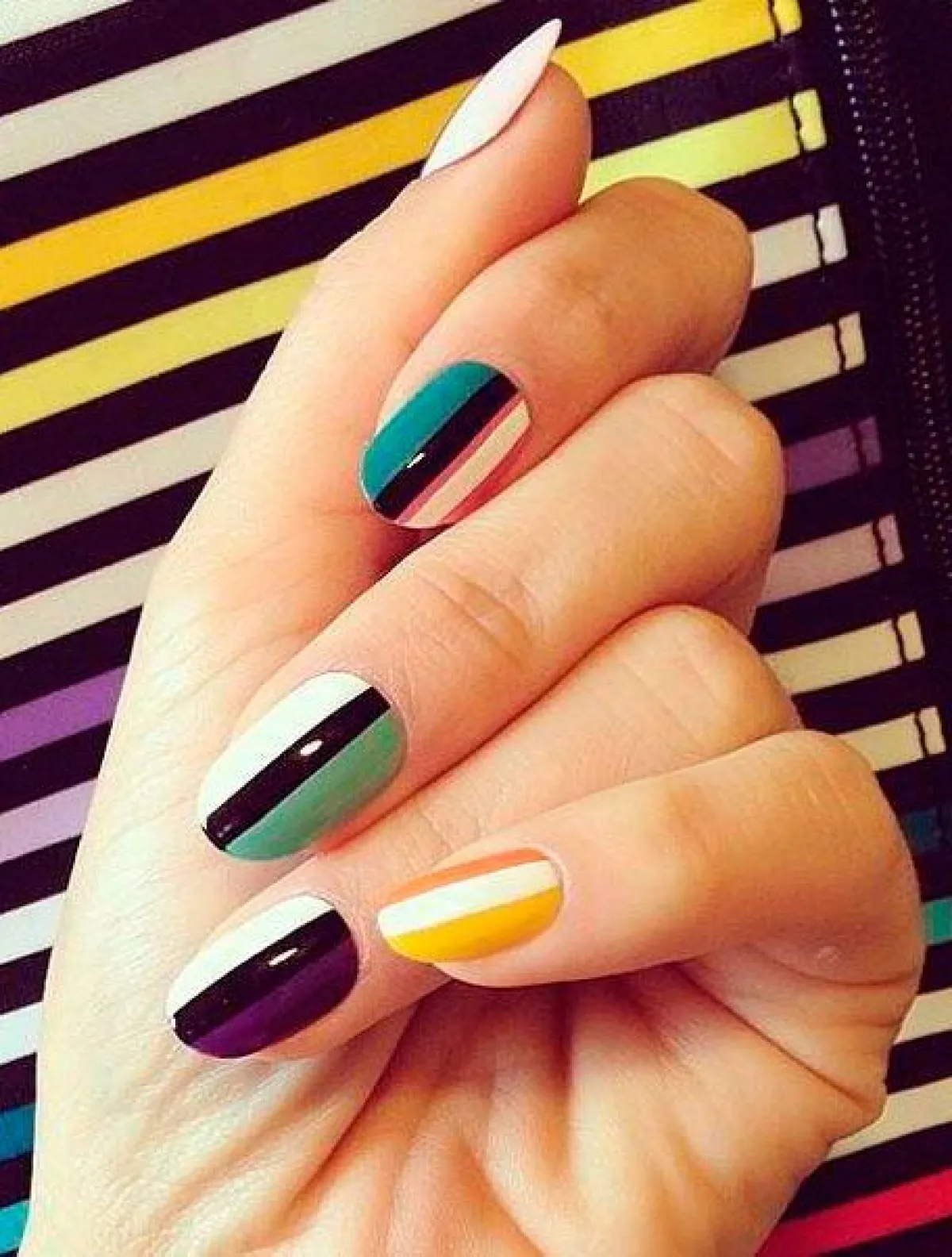 4. أظافر بالشرائط الملونة: هذا الشكل مميز أيضاً، ويناسبك صباحاً في الجامعة أو العمل أو حتى النزهات الصباحية، كل ما عليك فعله هو وضع طلاء الأظافر الأبيض على أظافرك مع تزيينها بخطوط من الألوان المختلفة لكل إصبع، ويمكنك وضع شرائط حمراء وزرقاء و"موف" وشرائط برتقالية.