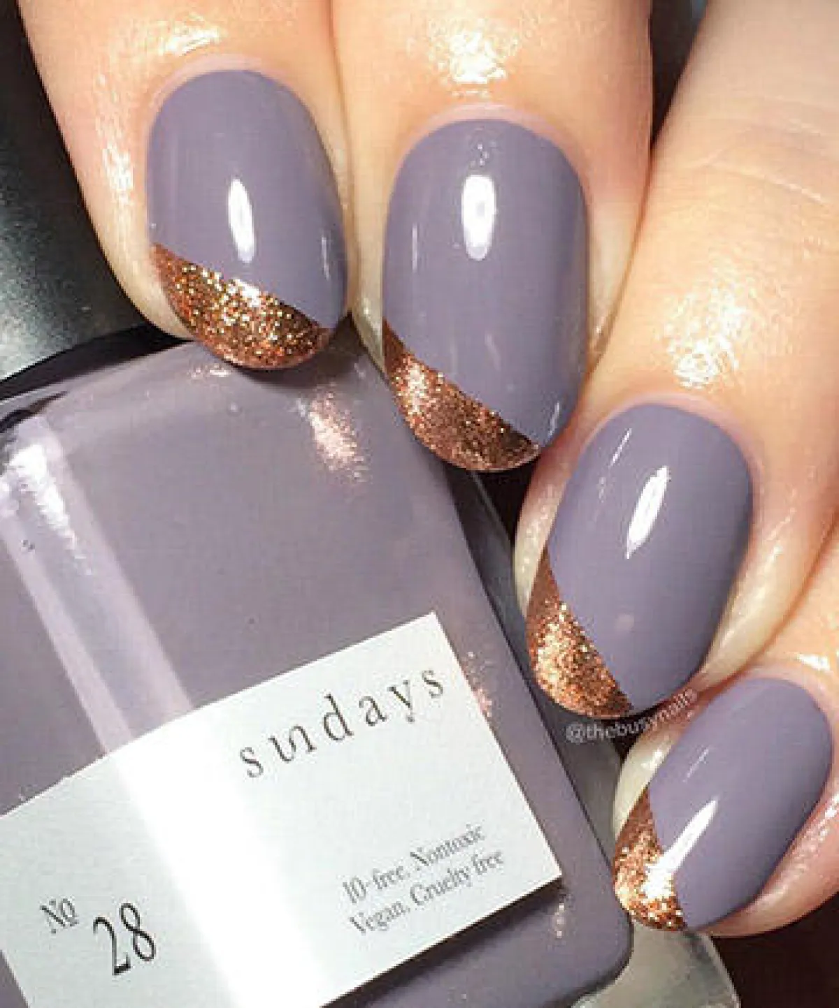 2. الأظافر الذهبية: شكل جديد ومميز للأظافر سيجعل أظافرك تناسب هذا الخريف كثيراً، كل ما عليك فعله للقيام بها هو وضع أي لون تفضلينه على أظافرك، لكن الأنسب هذا الخريف هو اللون الرمادي أو الأرجواني مع وضع مقدمة من اللون الذهبي الجذاب.