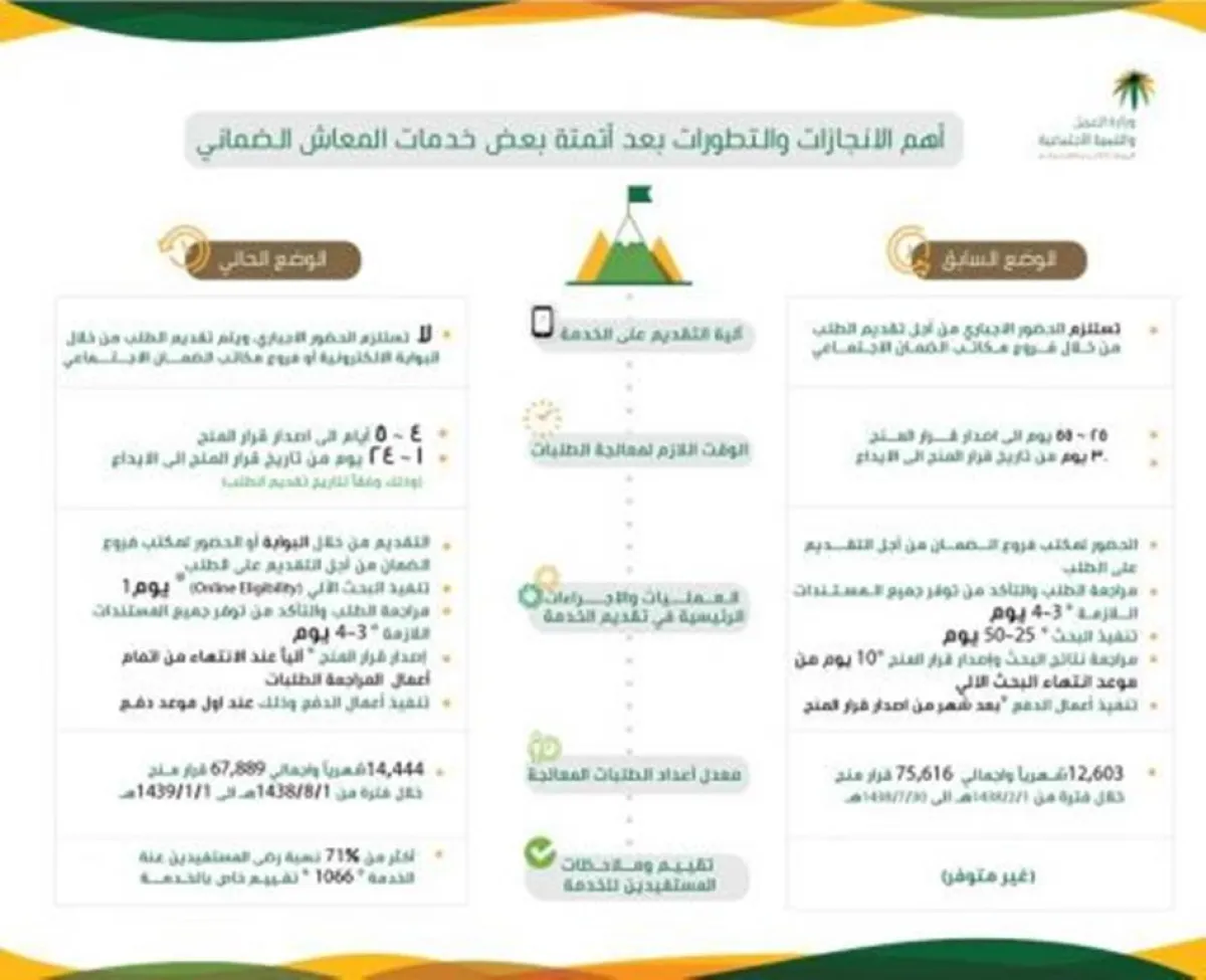 أطلقت وزارة العمل والتنمية الاجتماعية المرحلة الثانية من مشروع الخدمات الإلكترونية لمستفیدي الضمان الاجتماعي، وذلك بهدف التيسير على المستحقین للضمان وتخفیف نسبة المراجعین للمكاتب، وذلك من خلال تقدیم خدماتها وبرامجها للمستحقین عبر البوابة الإلكترونية.