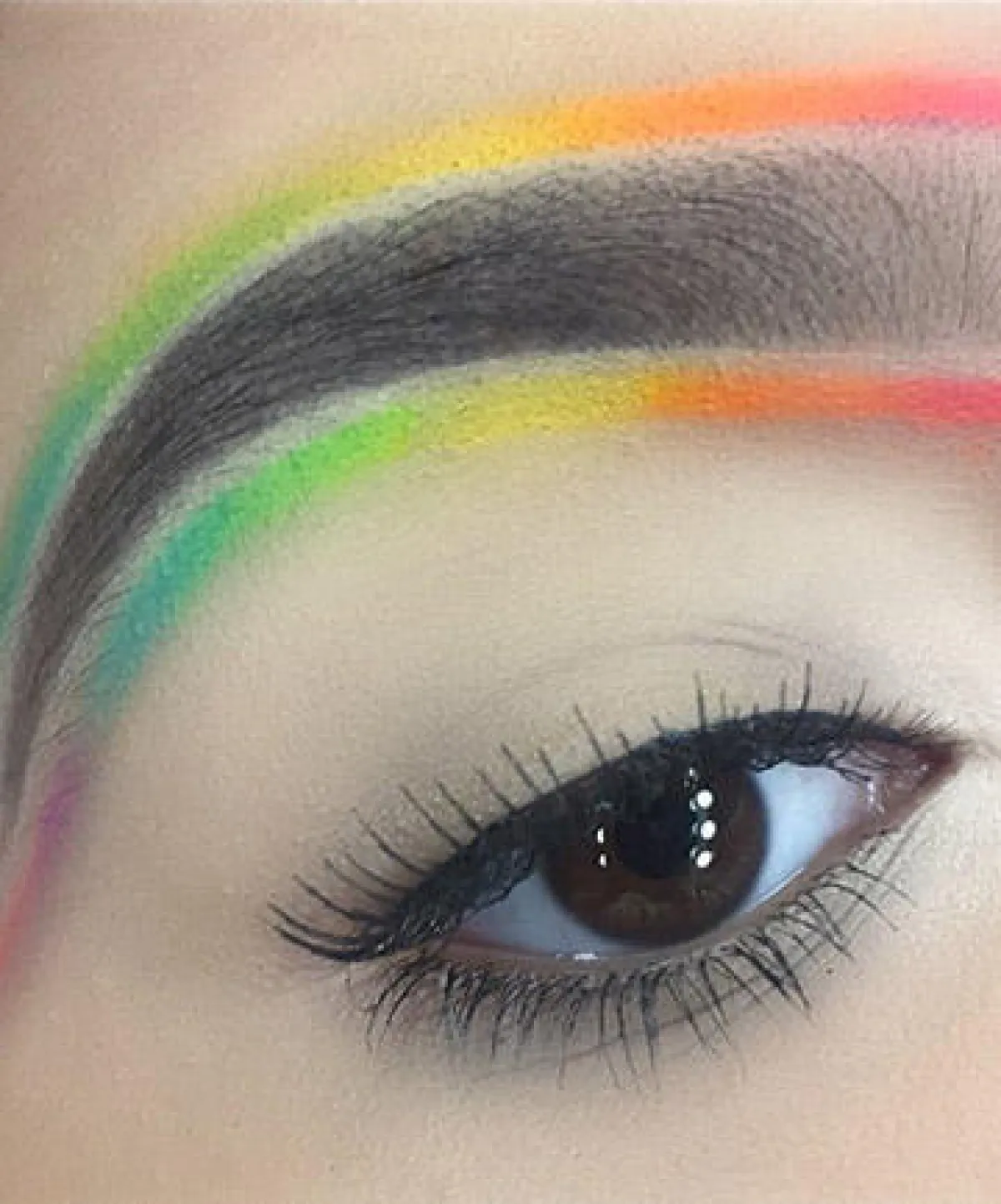 4. حواجب ألوان الطيف: من أسهل طرق رسم الحواجب، بالإضافة إلى أنها مميزة، وستميزك بالفعل، ولن تأخذ منك الكثير من الوقت، كل ما عليك فعله هو وضع خطين من ألوان الطيف "البرتقالي، الأصفر، الأخضر، الأزرق، البنفسجي" فوق حاجبيك وتحتهما، كما يمكنك التغيير في الألوان واختيار الأنسب لك ولملابسك.