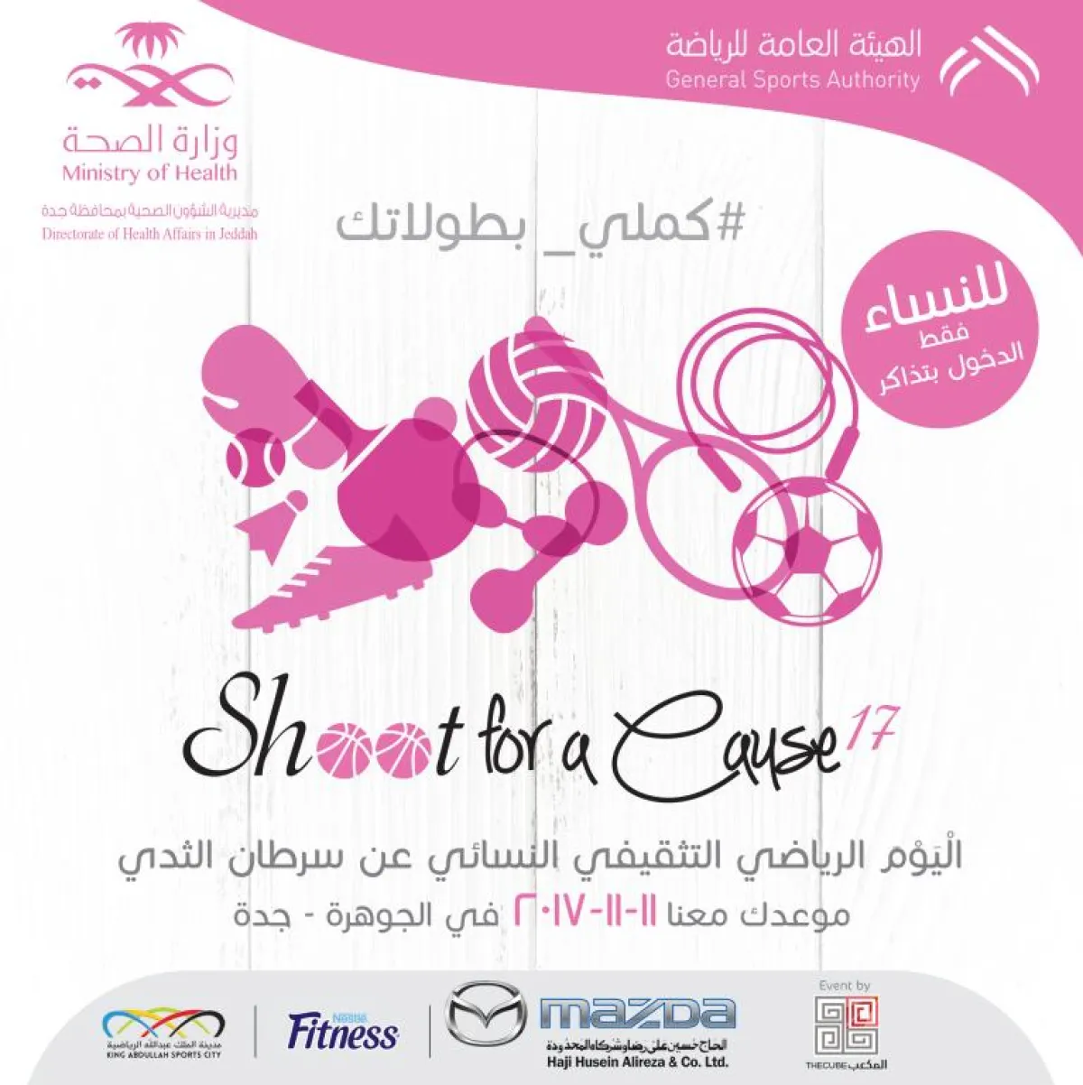 اليوم الرياضي التثقيفي النسائي لسرطان الثدي، بحضور الأميرة ريما بنت بندر بن سلطان بن عبدالعزيز، وكيلة التخطيط الاستراتيجي والتطوير ورئيس اتحاد الرياضة. وتحت رعاية وزارة الصحة والهيئة العامة للرياضة.