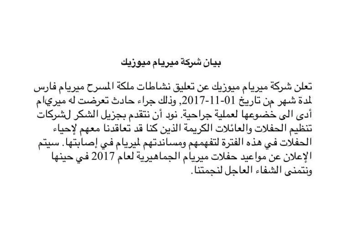 بالأمس وزع المكتب الإعلامي الخاص بالفنانة ميريام فارس، بيانًا صحافيًّا، أشار فيه الى تعرّضها لحادث استدعى دخولها المستشفى، وخضوعها لعملية جراحية، كما أشار البيان إلى أنّ ميريام قررت توقيف نشاطها الفني لمدة شهر كامل، بدءًا من تاريخ 1-11- 2017 ، كما تقدمت بالشكر إلى شركات تنظيم الحفلات والعائلات الكريمة التي تم التعاقد معها، لتفهّمها ومساندتها لميريام في إصابتها، على أن يتم الإعلان عن حفلات ميريام للعام 2017 في حينها.