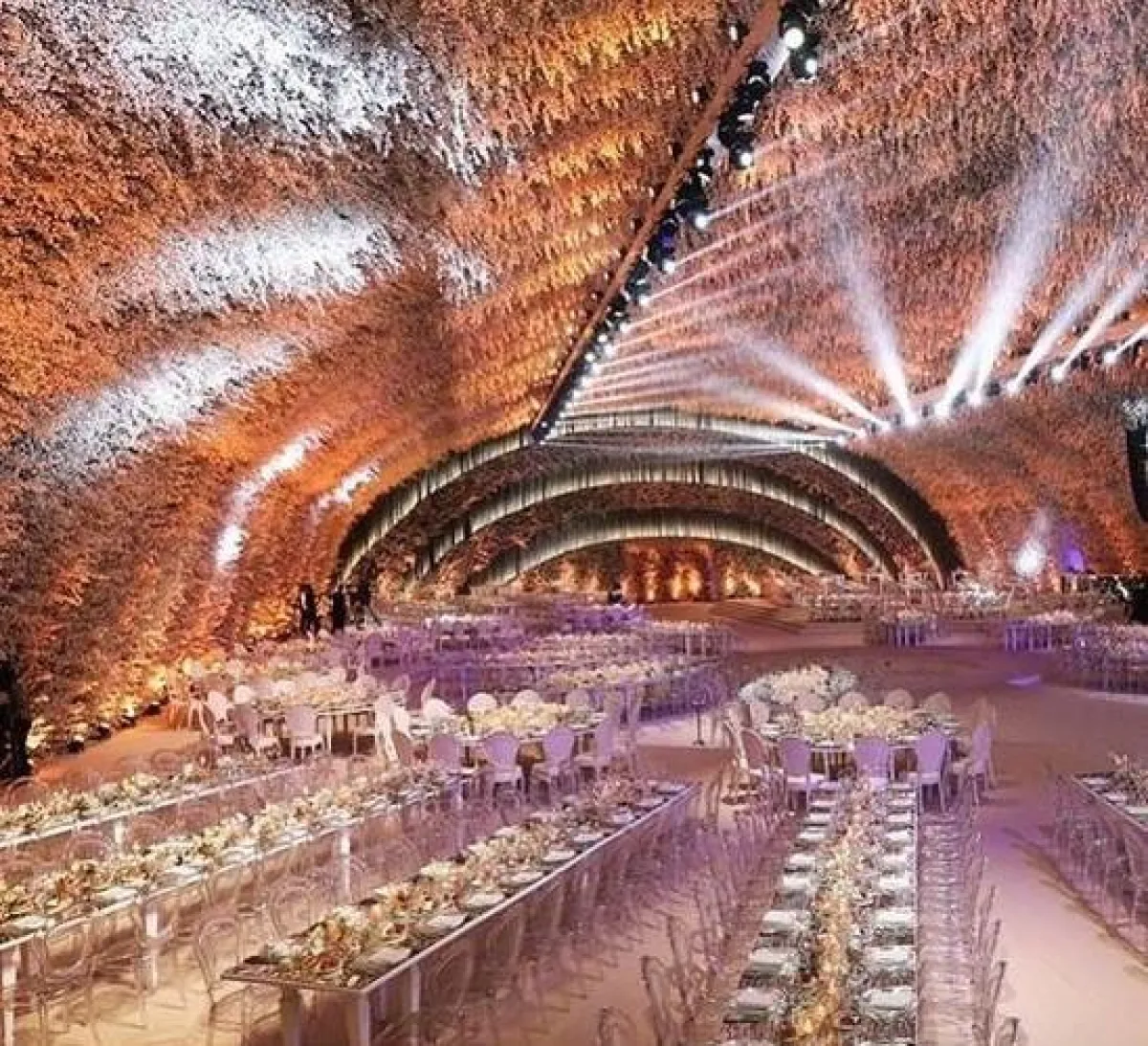 وبدت مراسم الزفاف فاخرة للغاية بتفاصيل صاخبة، حيث تزينت صالة الحفل بآلاف الورود ومشت العروس كأميرة تحت نفق تدلت من سقفه الورود الطبيعية.