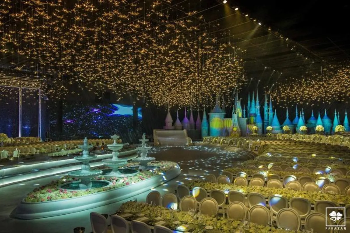 وتميزت قاعة الحفل التي نفّذها منظم الحفلات والمناسبات بول نصر، بآلاف حبات الكريستال على شكل طيور، وفي زاوية من قاعة الحفل، اختار نصر إضافة قصور صغيرة أصفت جوًّا ملوكيًّا على الحفل.